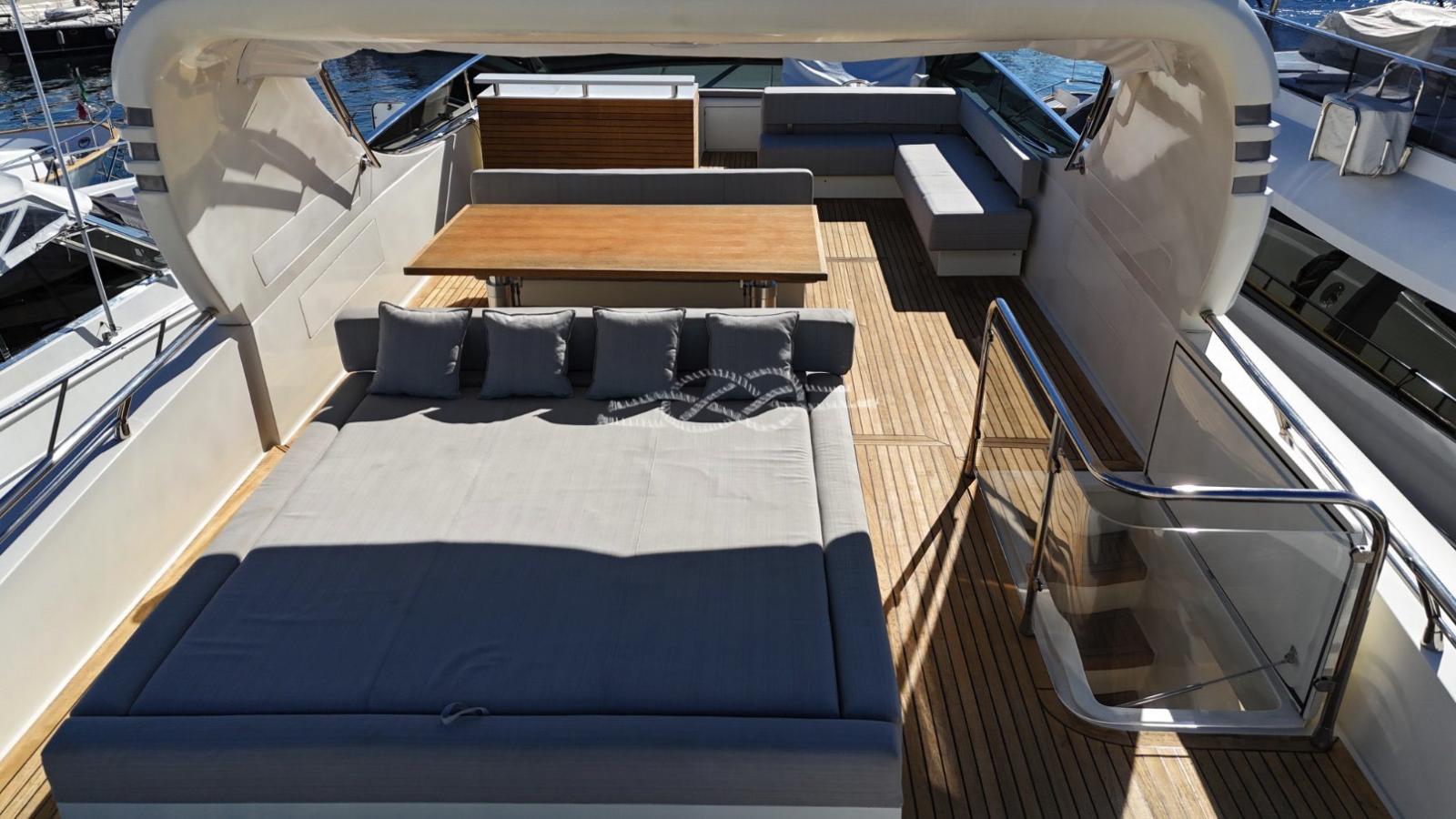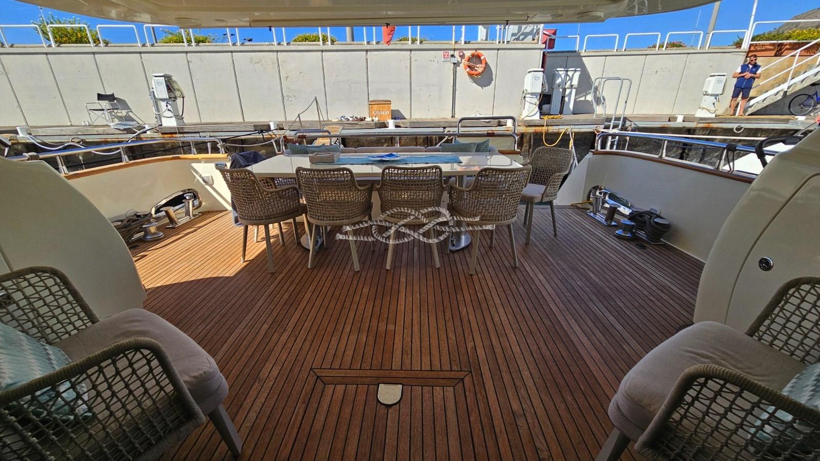nouvelle disposition du pont volant avec la création d’une nouvelle terrasse d’ensoleil, d’une table avec deux sièges opposés, d’un canapé en L, d’un meuble bar.