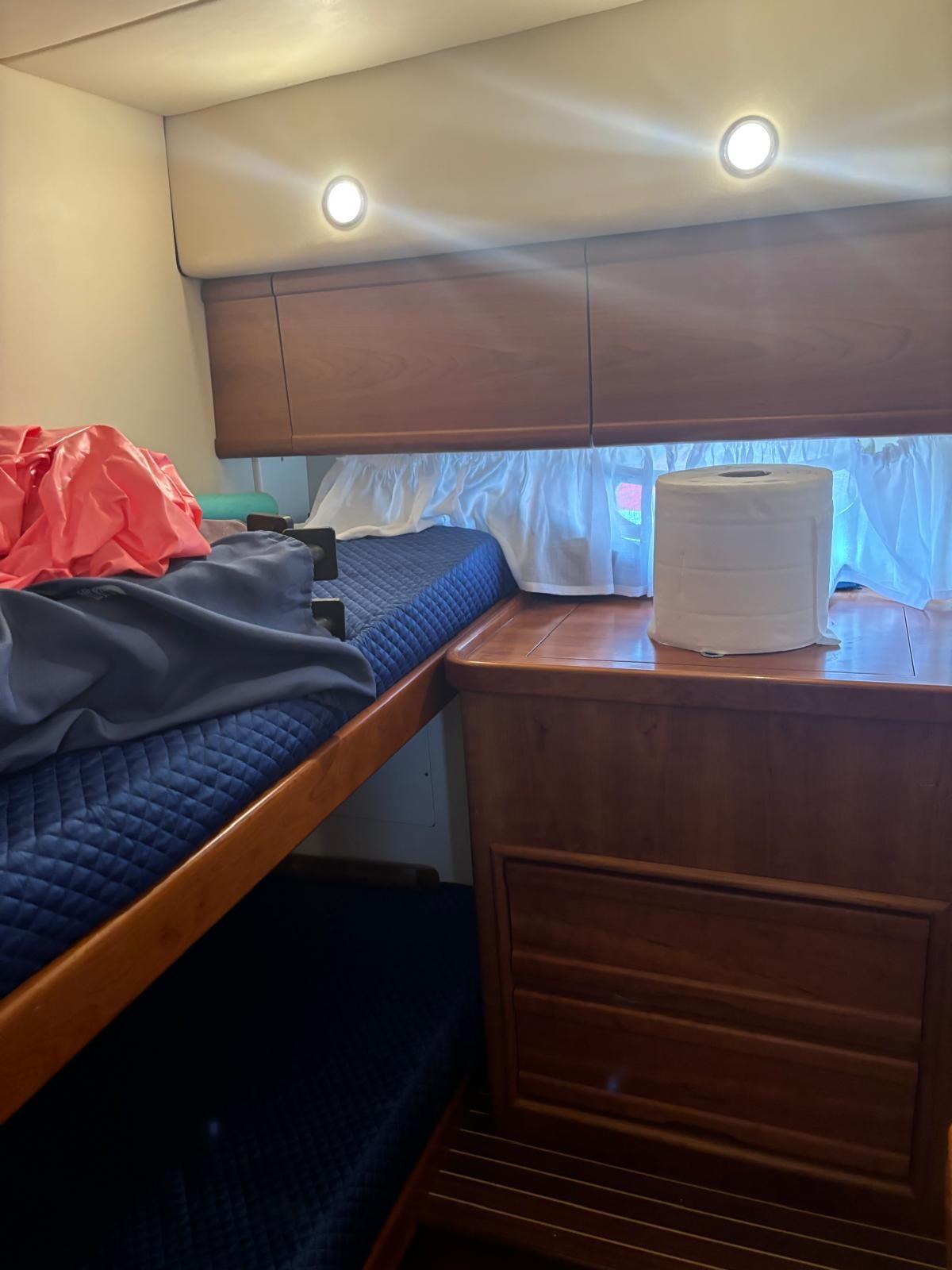 Cabine principale avec lit double - cabine d’invités avec deux lits superposés - salle de bain.