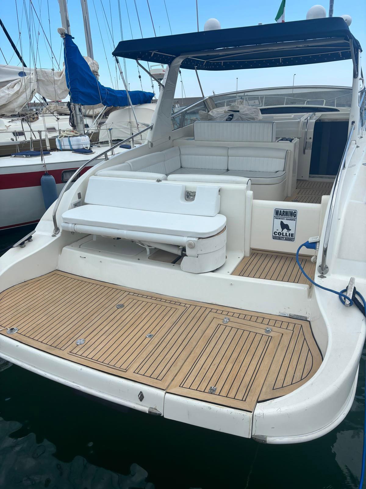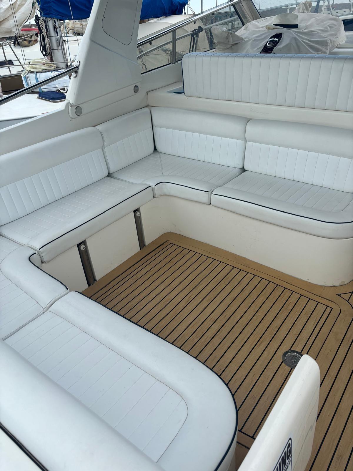 démontage et révision des sterndrives Mercruiser 3X (casque, huile, zincs) - révision des pompes de trim avec remplacement des contacteurs électriques - installation de n° 6 feux sous-marins bleus - remplacement du transducteur d’échosondeur - révision de la passerelle hydraulique (remplacement des conduites d’huile et nouveau panneau à boutons-poussoirs) - construction de nouveaux coussins pour la passerelle (utilisation du canapé) - écriture de poupe en acier inoxydable rétroéclairé bleu - entretien extraordinaire des moteurs Yanmar avec remplacement des capteurs de pression d’huile et zincs internes, vidange d’huile et filtres - remplacement des filtres Racor - installation du support moteur auxiliaire du tender dans le compartiment moteur - démontage et déchargement du générateur Paguro 3000 pour entretien extraordinaire - remplacement des câbles d’accélérateur - nouveau réfrigérateur de cockpit - remplacement du moteur et des batteries de service - remplacement de l’autoclave - nouveau sin-teak pour le cockpit et la plate-forme arrière - nouveau four à micro-ondes - nouvel auvent rigide relié à l’arceau de sécurité (avant et arrière) - polissage du pavois - Ensemble propulseur d’étrave.