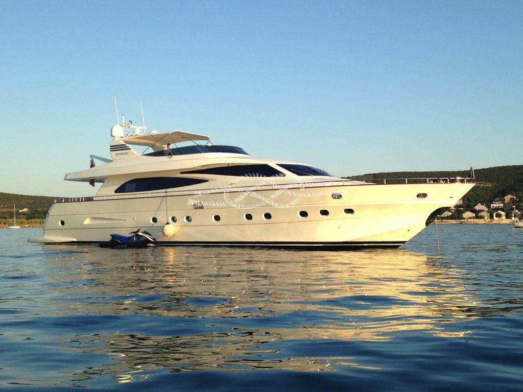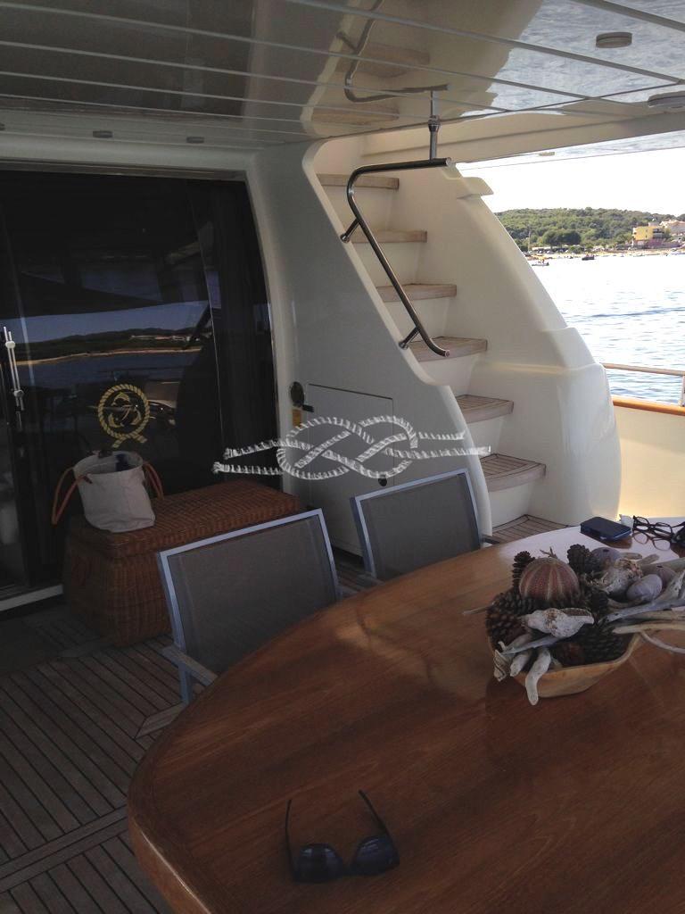 Alarme moteur, Alarme de pompe de cale, Eau sous pression, Système de vidange, Passavant en teck, Douche de cockpit, Double barre à roue, Flaps hydrauliques, Grue de flybridge, Extincteur(s) fixe(s), Indicateurs de flaps, Lavage de chaine, Éclairage de courtoisie, Spots sous-marins, Passerelle, Plateforme arrière (con meccanismo tender lift), Pompe de cale automatique, Porte latérale, Porte latérale, Cockpit en teck, Prise de quai, Connexion eau sous pression à quai, Onduleur, Répétiteur électronique, Rollbar, Guindeau électrique, Echelle de bain, table de cockpit, Corne, Winch électrique arrière.