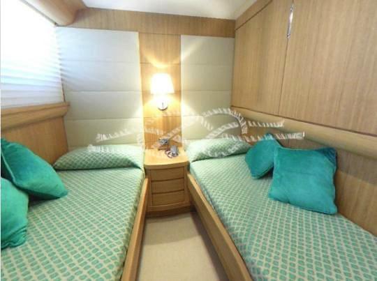 Cabine principale avec lit double, salle de bain et dressing - Cabine VIP avec deux lits plats et salle de bain - Cabine d’invités avec deux lits plats, troisième lit escamotable et salle de bain - Cabine d’invités avec deux lits plats, troisième lit escamotable et salle de bain.