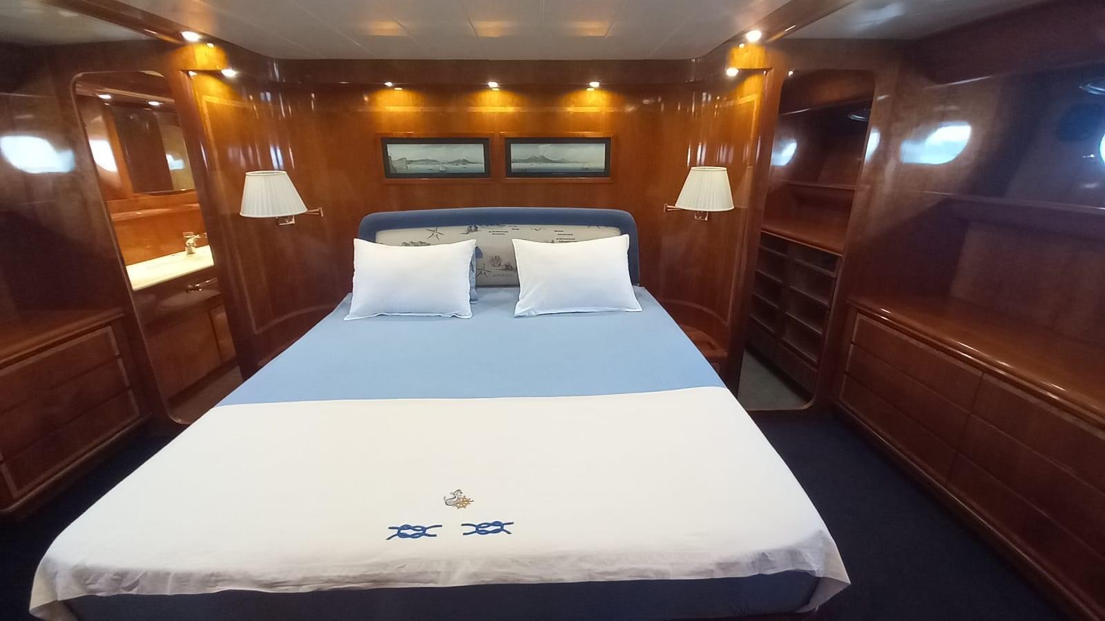 Cabine principale avec lit double, dressing et salle de bain avec douche séparée - Cabine VIP avec deux lits plats et salle de bain - Cabine invités avec deux lits plats et salle de bain - Cabine invités avec deux lits plats et salle de bain.