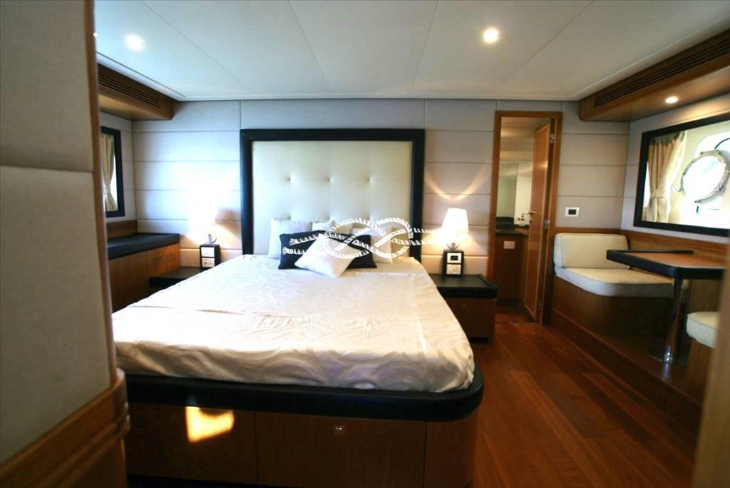 Cabine principale au milieu du navire avec lit double et petit dressing, salle de bain pleine largeur avec douche séparée - Cabine VIP avec lit double et salle de bain - cabine d’invités avec deux lits au sol - cabine d’invités simples - salle de bain d’invités - deux cabines d’équipage simples - salle de bain d’équipage.