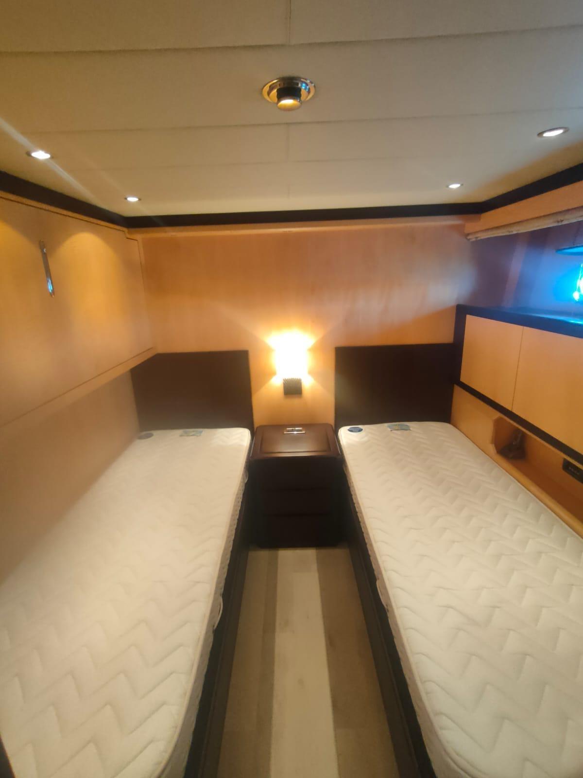 Cabine principale avec lit double et salle de bain - cabine d’invités avec lit double et salle de bain - cabine d’invités avec deux lits plats et salle de bain.