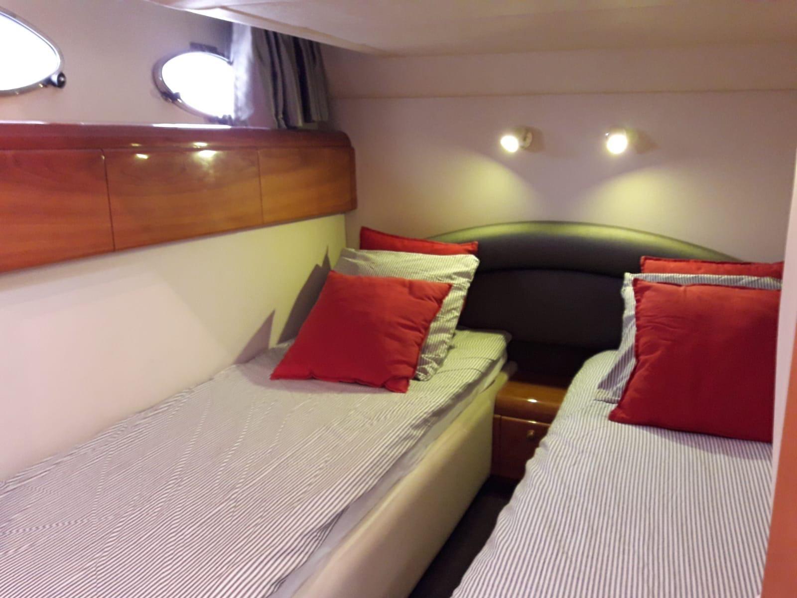 Cabine principale avec lit double et salle de bain - cabine d’amis avec deux lits plats (convertible en double) - cabine d’amis avec deux lits plats (convertible en double) - salle de bain d’invités.