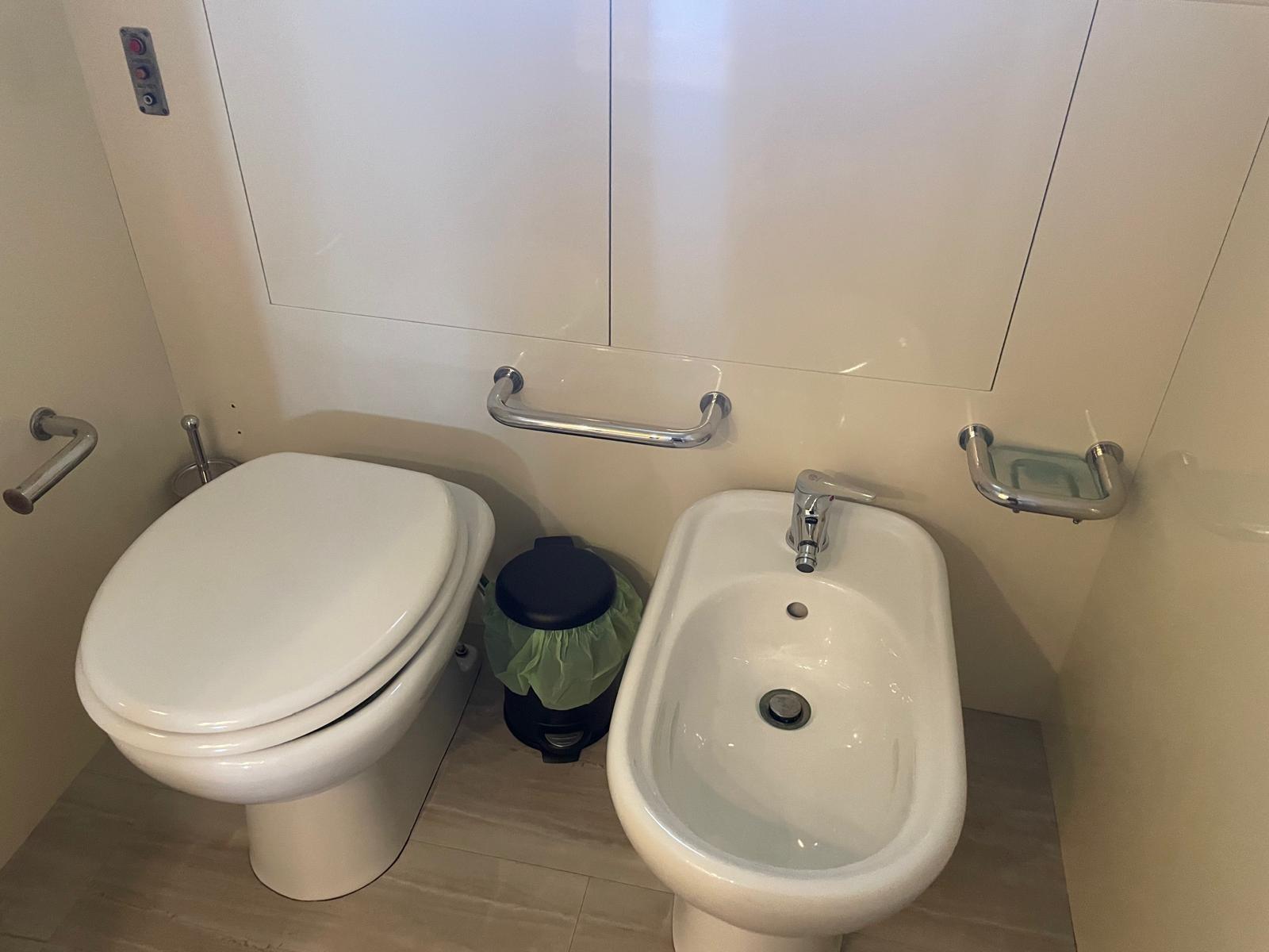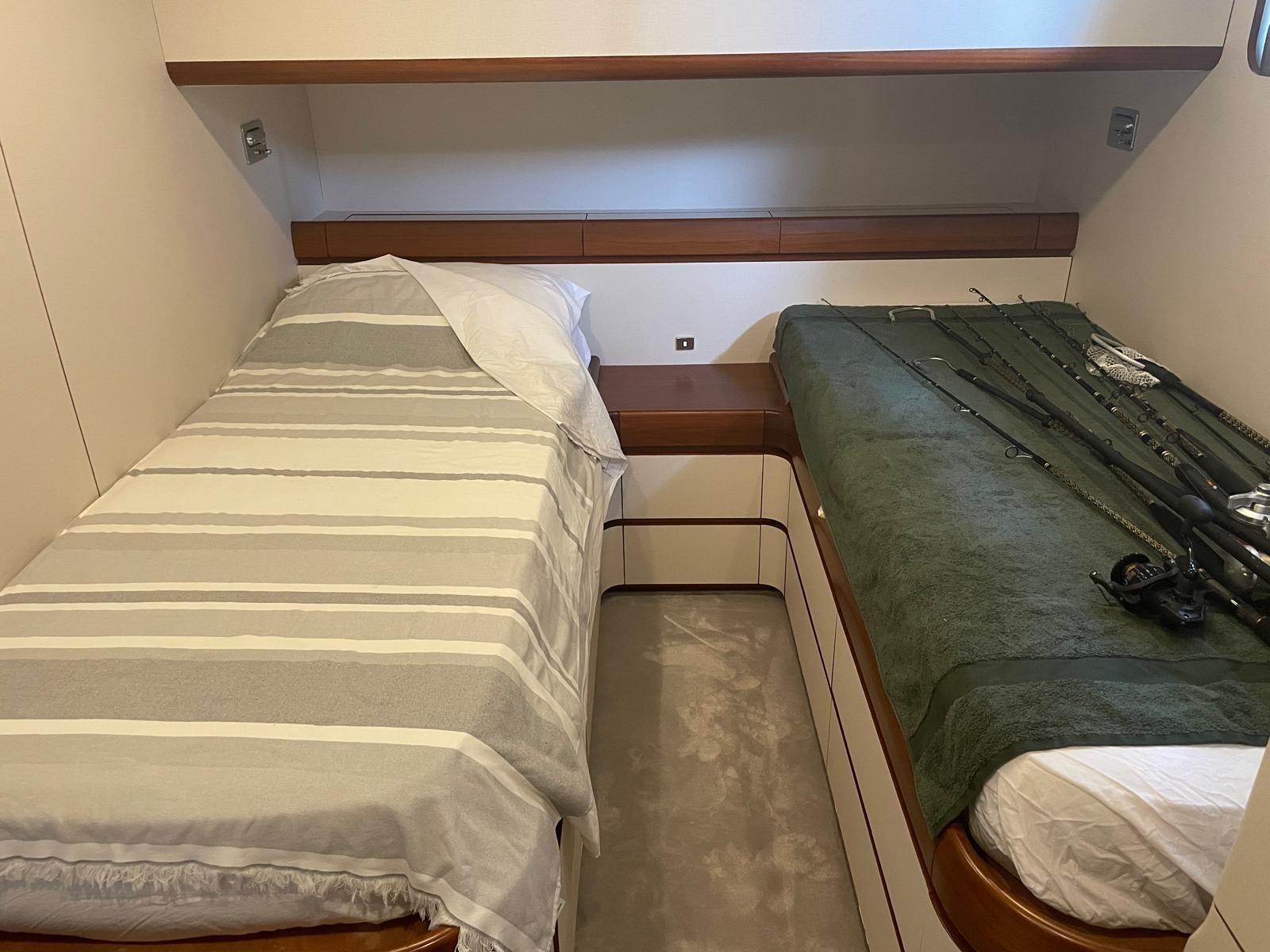 Cabine principale avec lit double et salle de bain (toilettes, bidet et douche séparée) - cabine d’invités avec deux lits plats et salle de bain (toilettes, bidet et douche séparée) - cabine d’invités avec deux lits plats et salle de bain (toilettes, bidet et douche séparée) - cabine d’invités avec deux lits plats, troisième lit escamotable et salle de bain (toilettes, bidet et douche séparée).