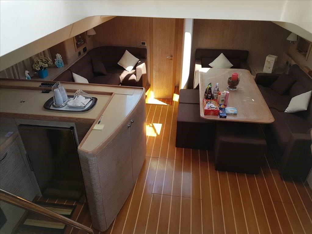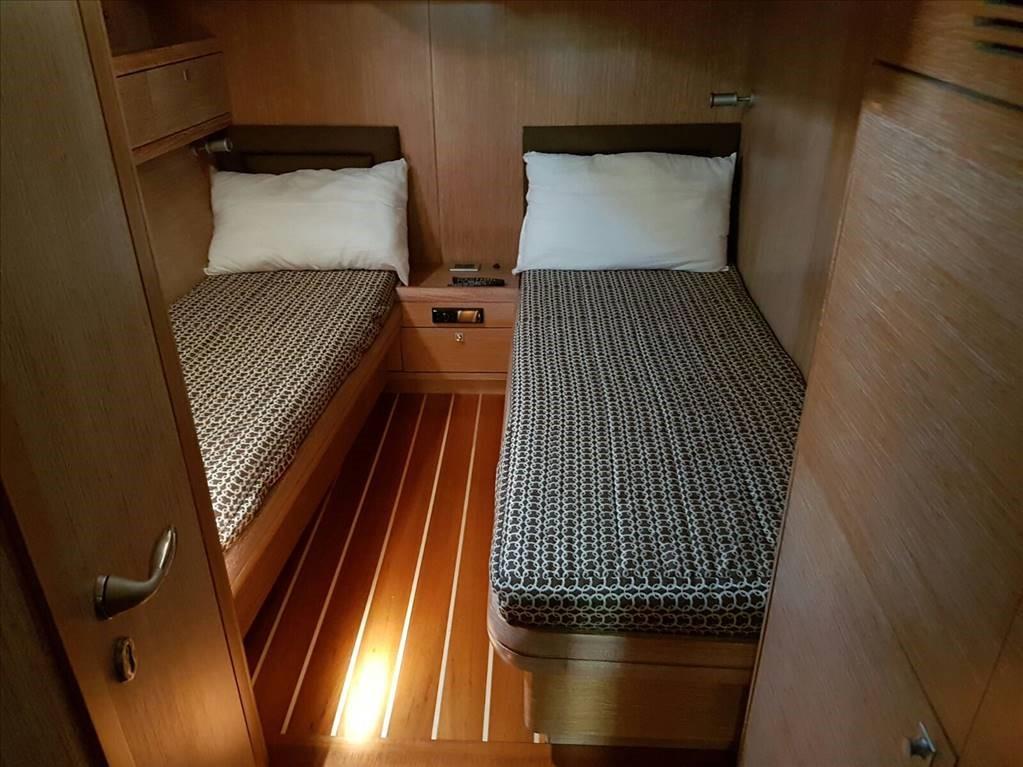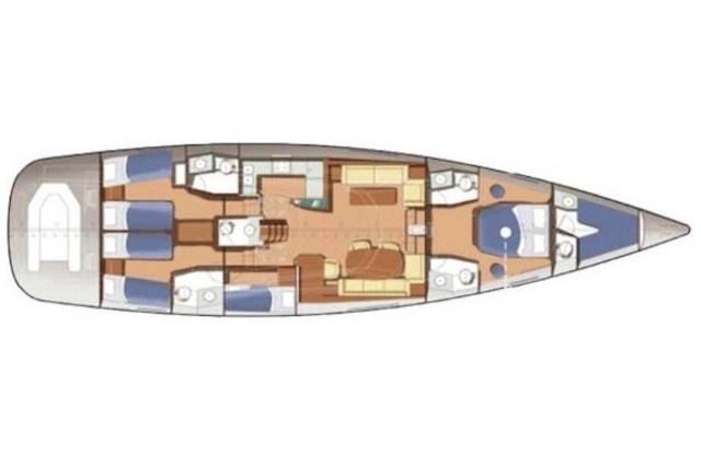 Grand cockpit avec table - dinette avec canapés, table et cuisine - table et station de cartes - version avec cabine principale avec lit double et salle de bain à l’avant - cabine invités avec deux lits plats et salle de bain - cabine invités avec deux lits plats au milieu du bateau tous deux vers la poupe - cabine invités avec deux lits superposés - salle de bain invités partagée entre la cabine avec lits superposés et la cabine avec lits plats.