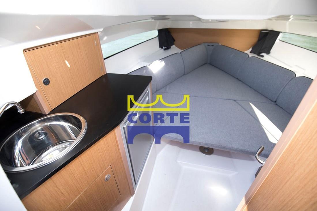 Eau sous pression, 3 Batteries, Douche de cockpit, Lavabo dans le cockpit, Pompe de cale manuelle, Onduleur, Guindeau électrique, Echelle de bain, T-Top (grafite nero).