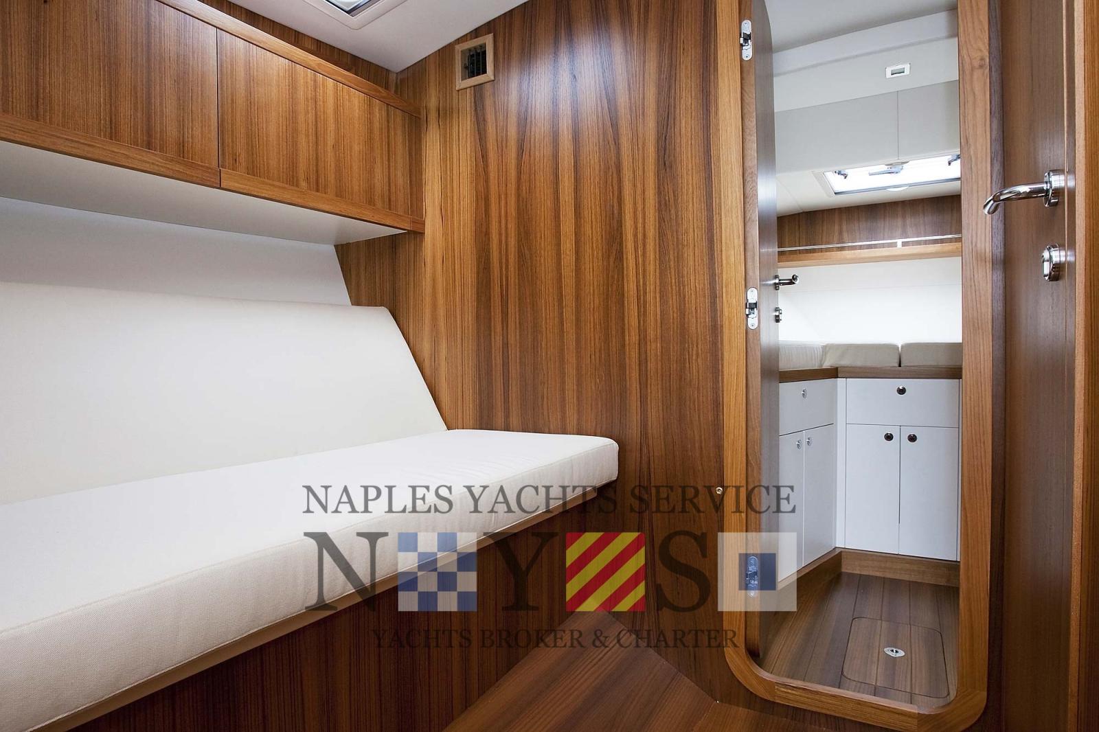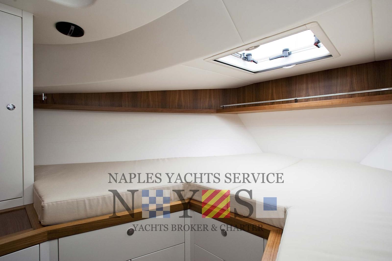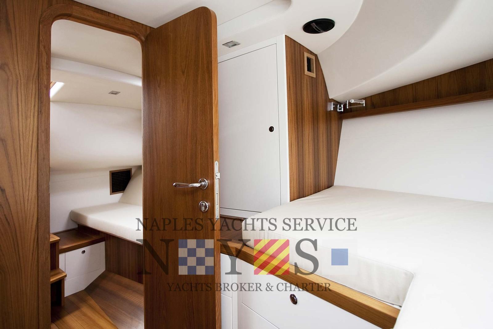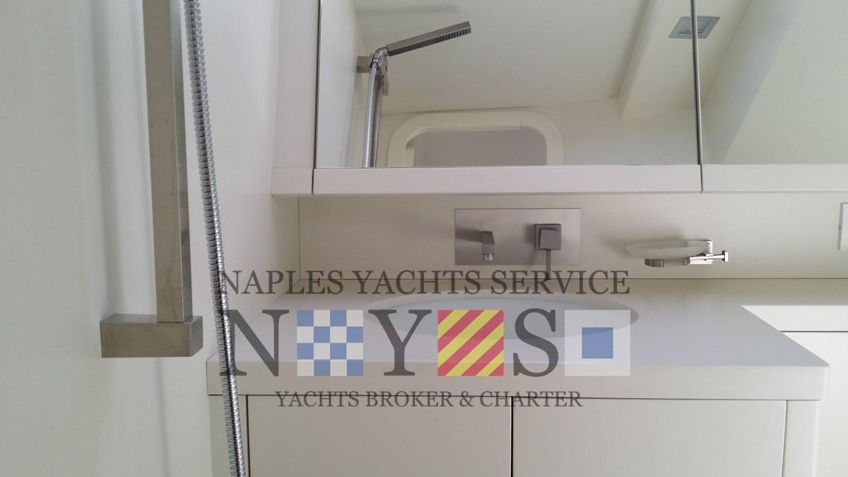 2 Alarme moteur, Alarme de pompe de cale, Eau sous pression, 4 Batteries, Passavant en teck (Fuga grigia), Douche de cockpit, Flaps hydrauliques, Hard top (elettrico), Extincteur(s) fixe(s), Lavage de chaine, Éclairage de courtoisie, Plateforme arrière (con piano di calpestio in teak), 4 Pompe de cale automatique, Porte latérale, Prise de quai, Onduleur, Guindeau électrique, Echelle de bain, table de cockpit, Corne, T-Top.