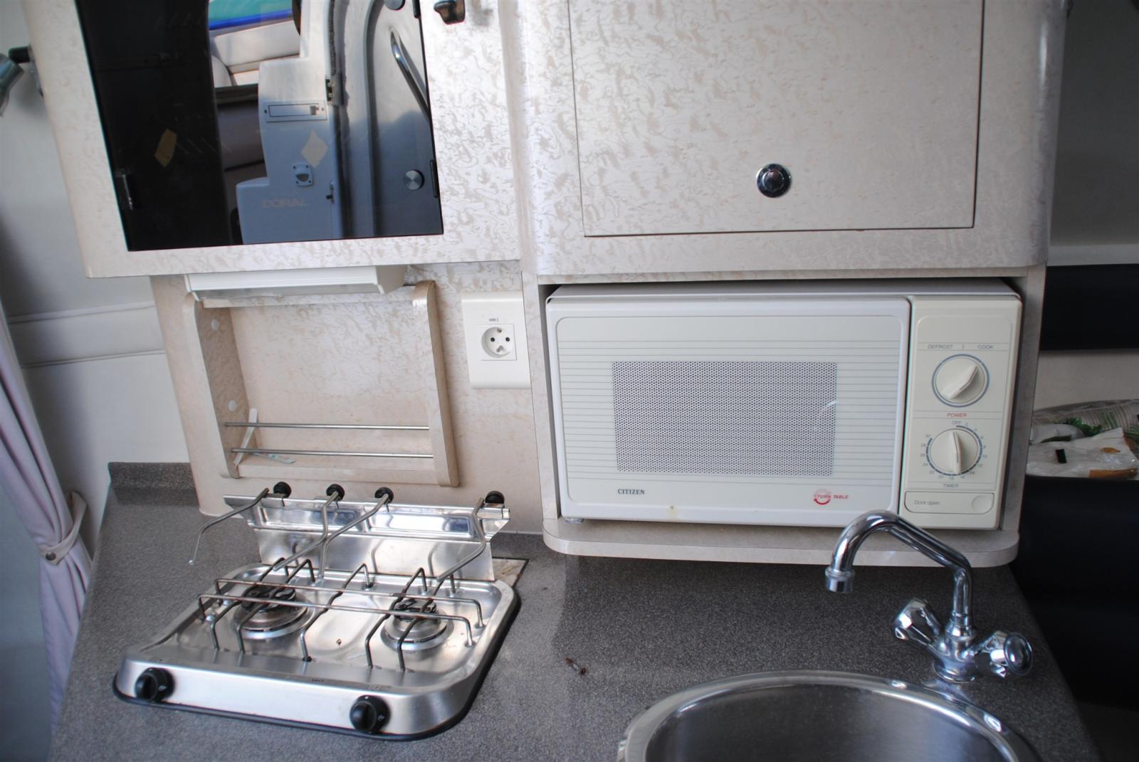 Alarme moteur, Eau sous pression, Douche de cockpit, Lavabo dans le cockpit, Éclairage de courtoisie, Plateforme arrière, Porte latérale, Prise de quai, Guindeau électrique, Echelle de bain, table de cockpit, Table pliante de salon.