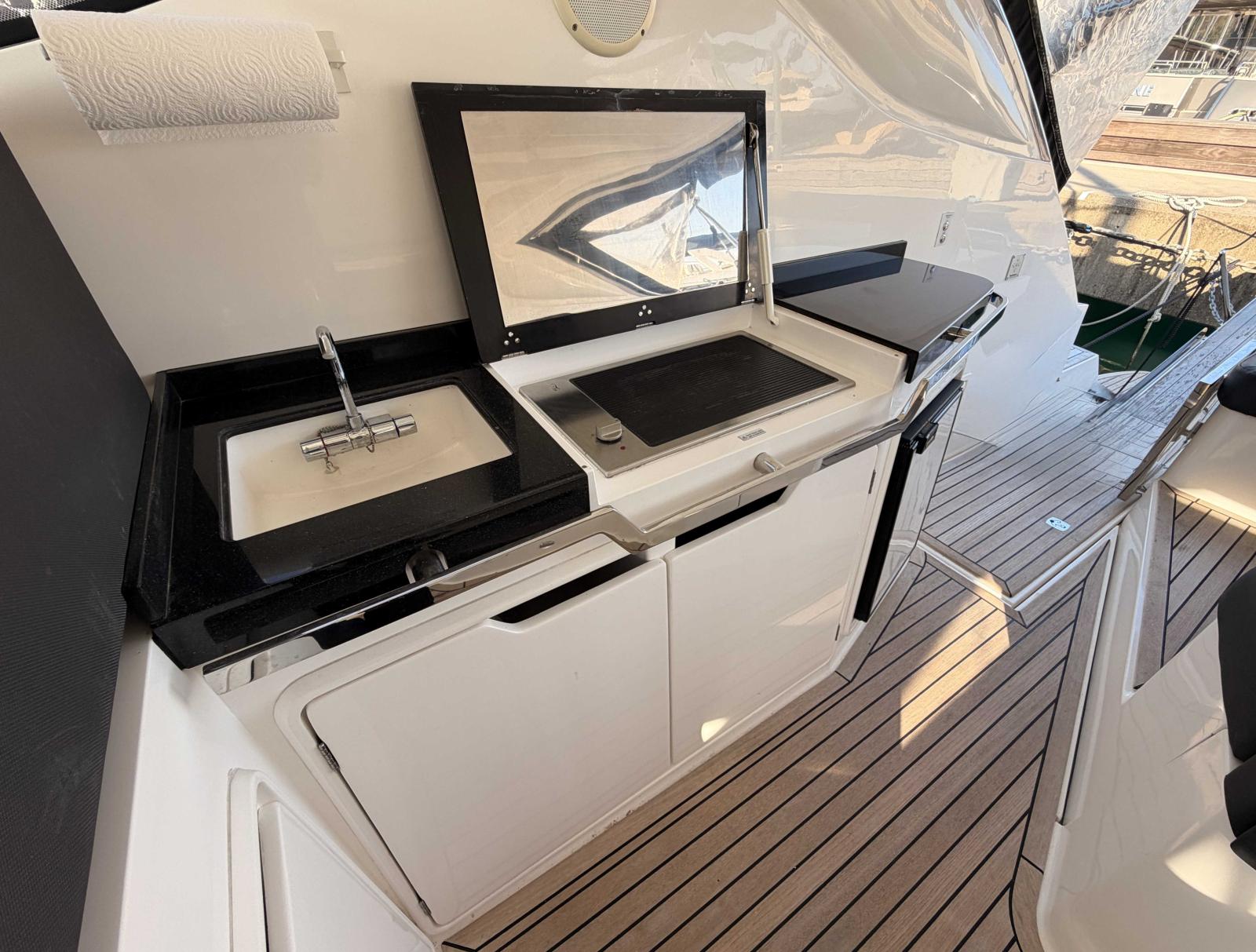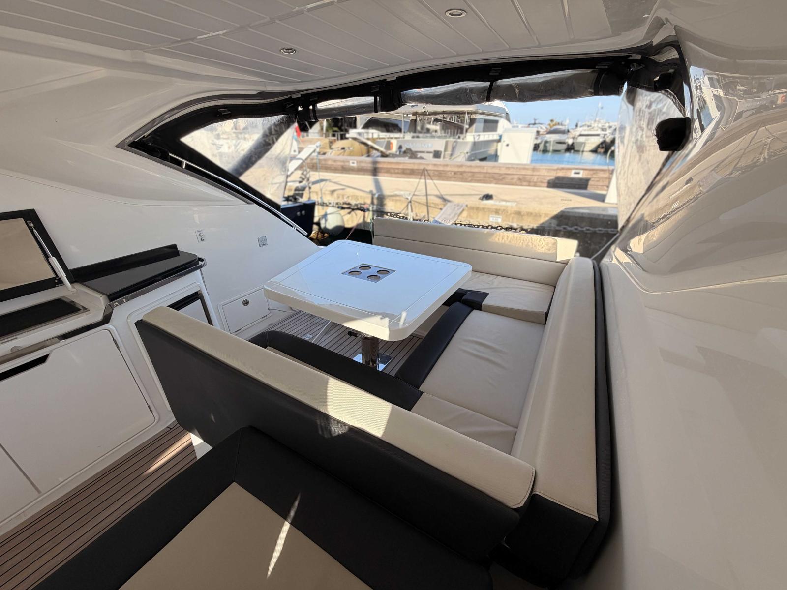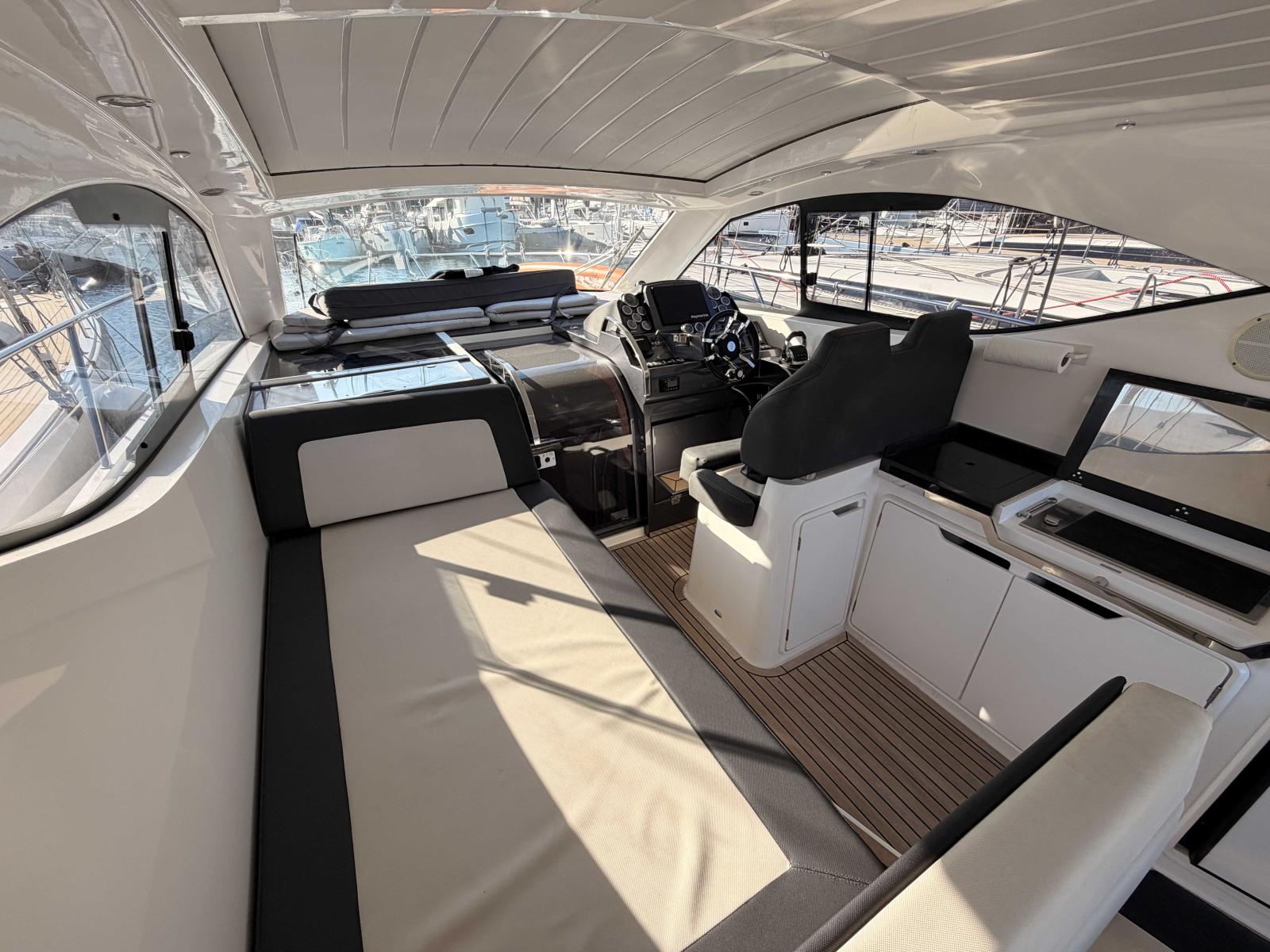 Le cockpit propose un espace convivial, organisé autour d’un wetbar équipé (plancha, évier, réfrigérateur), ainsi que de généreuses zones de détente, idéales pour profiter pleinement des journées en mer.