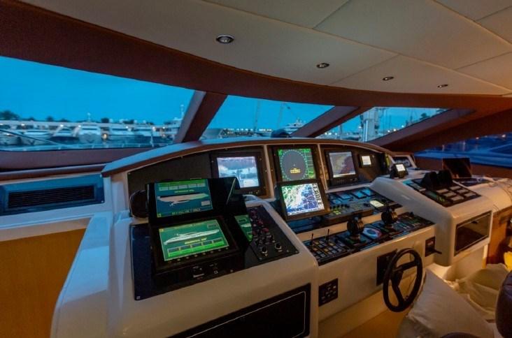 Compas (magnetica), Commande électrique (MTU), Ordinateur fixe de bord, Compteur de chaîne, Moniteur (elettronici del motore MTU), Sondeur pêche (Raymarine), Fax (HP 5522), GPS (Furuno), Joystick (sul sedile sportivo della timoneria), Moniteur de consommation, Pilote automatique (Simrad AP70), Plotter GPS (Garmin + Timezero GPS con navigazione 3D), Panneau de commande, Radar (Furuno), Radio VHF (Furuno), Téléphone GSM (Iridium).