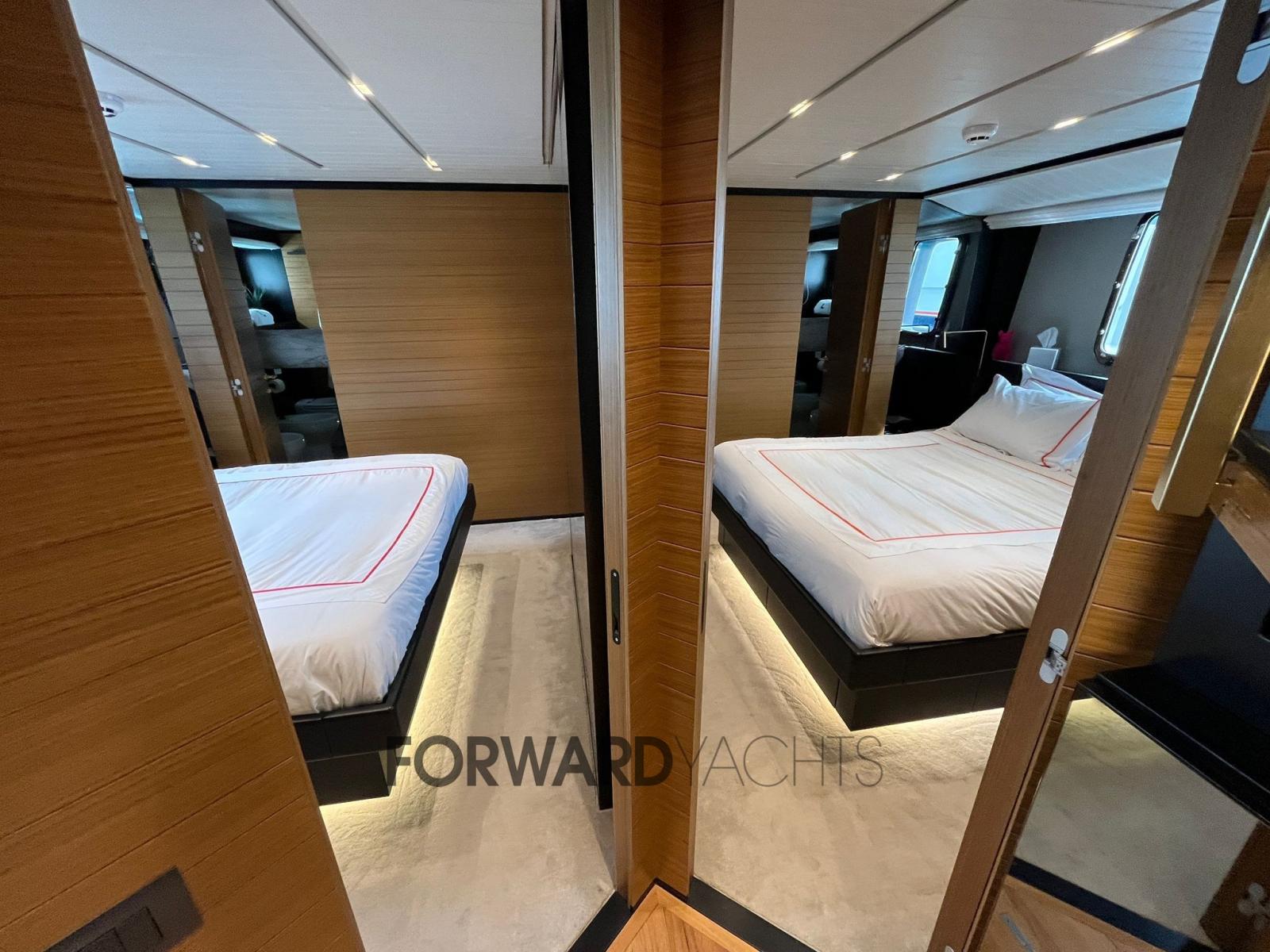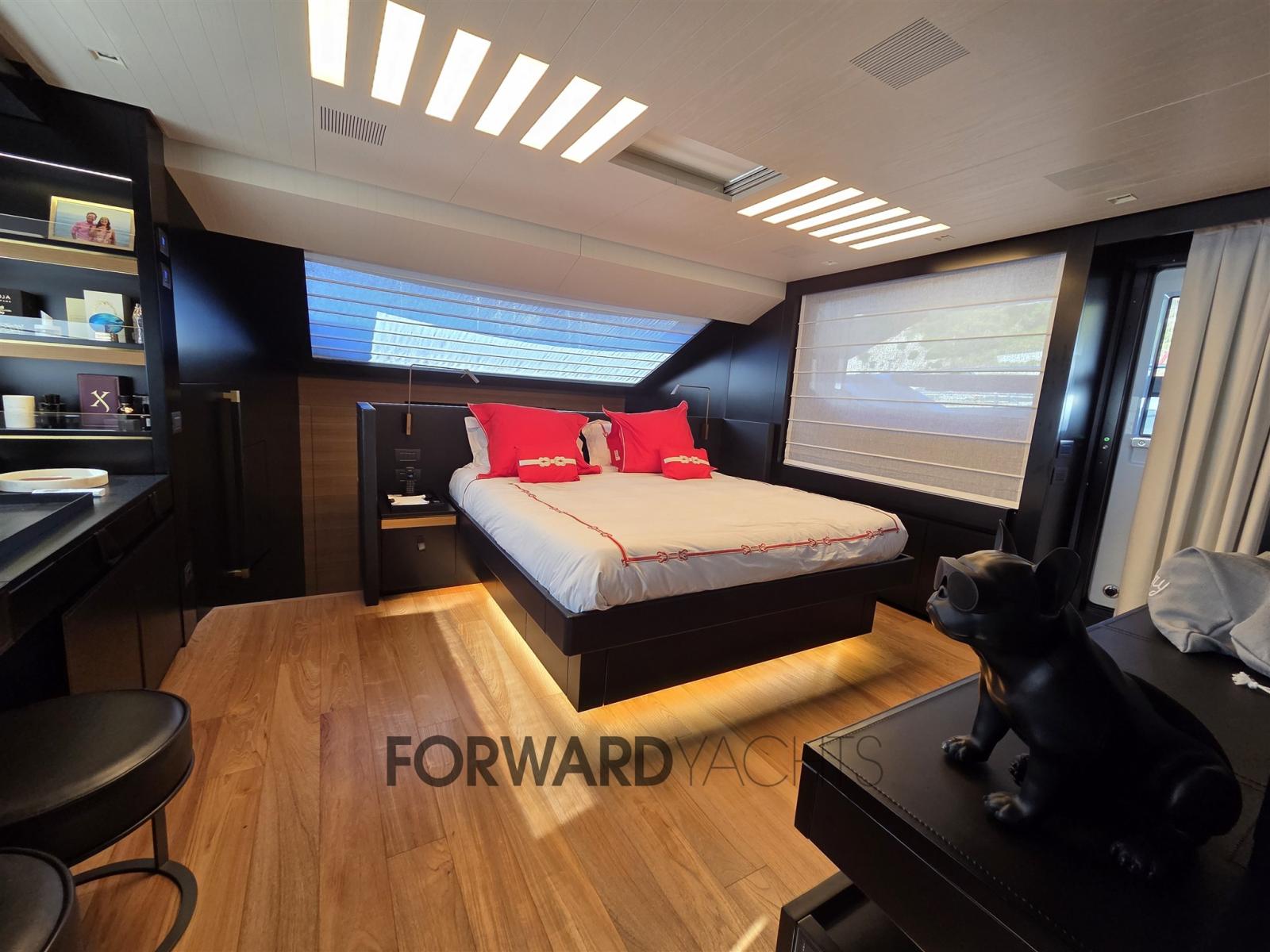 Espace de couchage : 5 cabines (1 cabine principale sur le pont principal) + 3 cabines d’équipage.