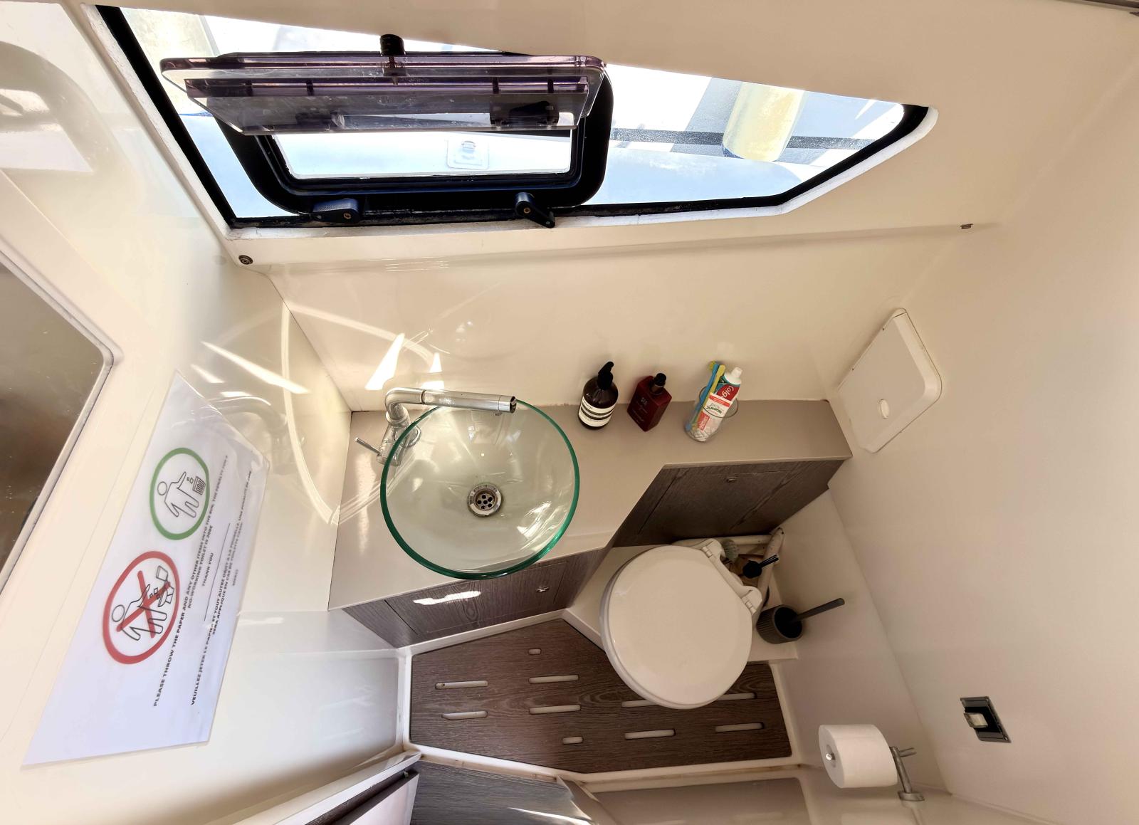 À l’intérieur, le bateau dispose d’une cabine avec couchage double ainsi que d’une salle d’eau, apportant un confort appréciable à bord.
