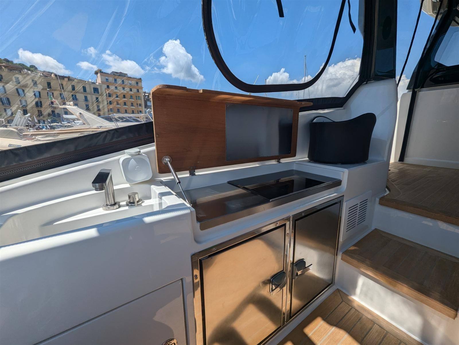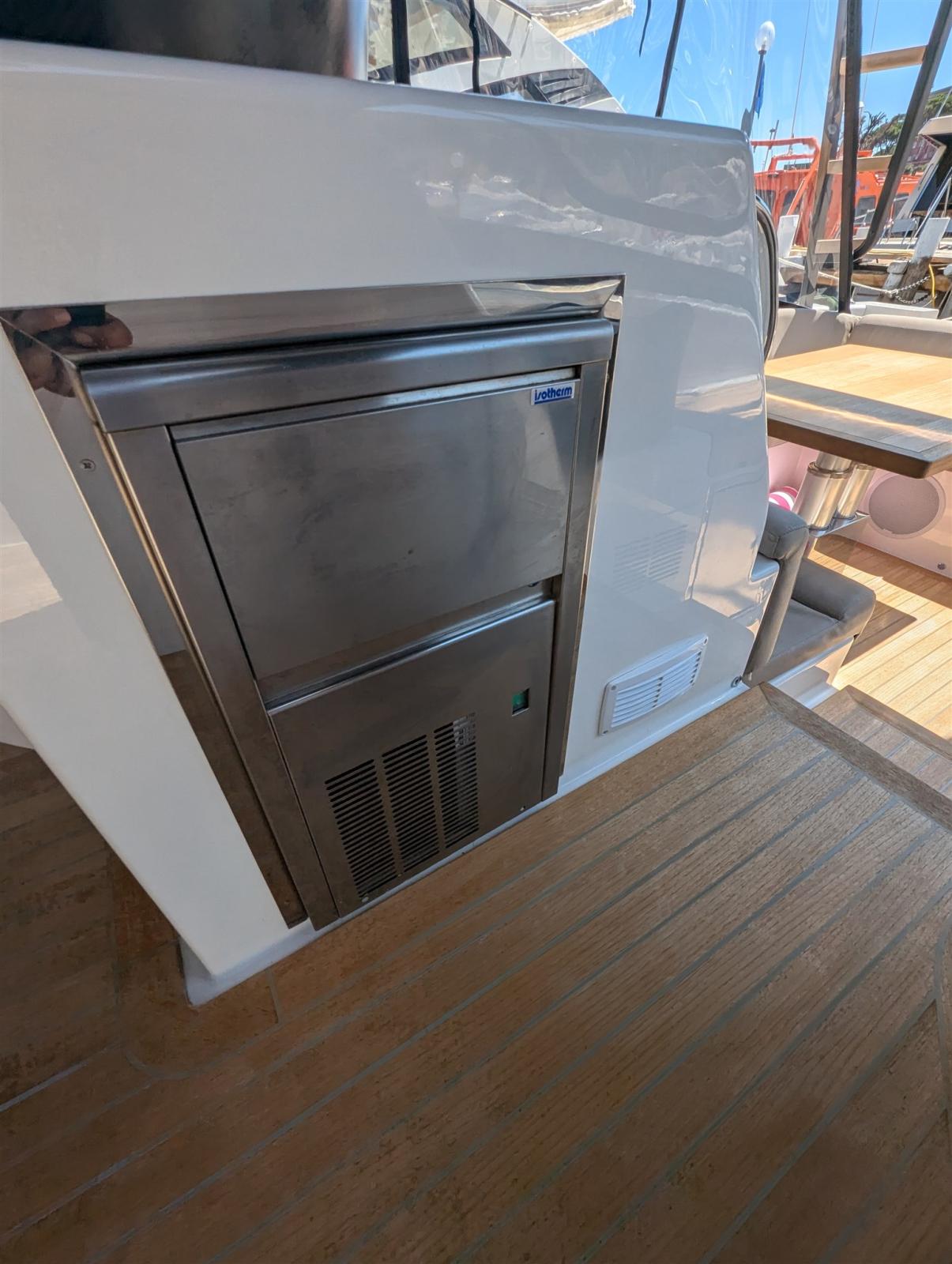 Cuisine (Exterior side bar cabinet with sink mixer tap water cold and warm with teak top), 2 Réfrigérateur extérieur, Réfrigérateur intérieur (aggiuntivo), Machine à glaçons (6,5 kg/h), Plaque vitrocéramique.
