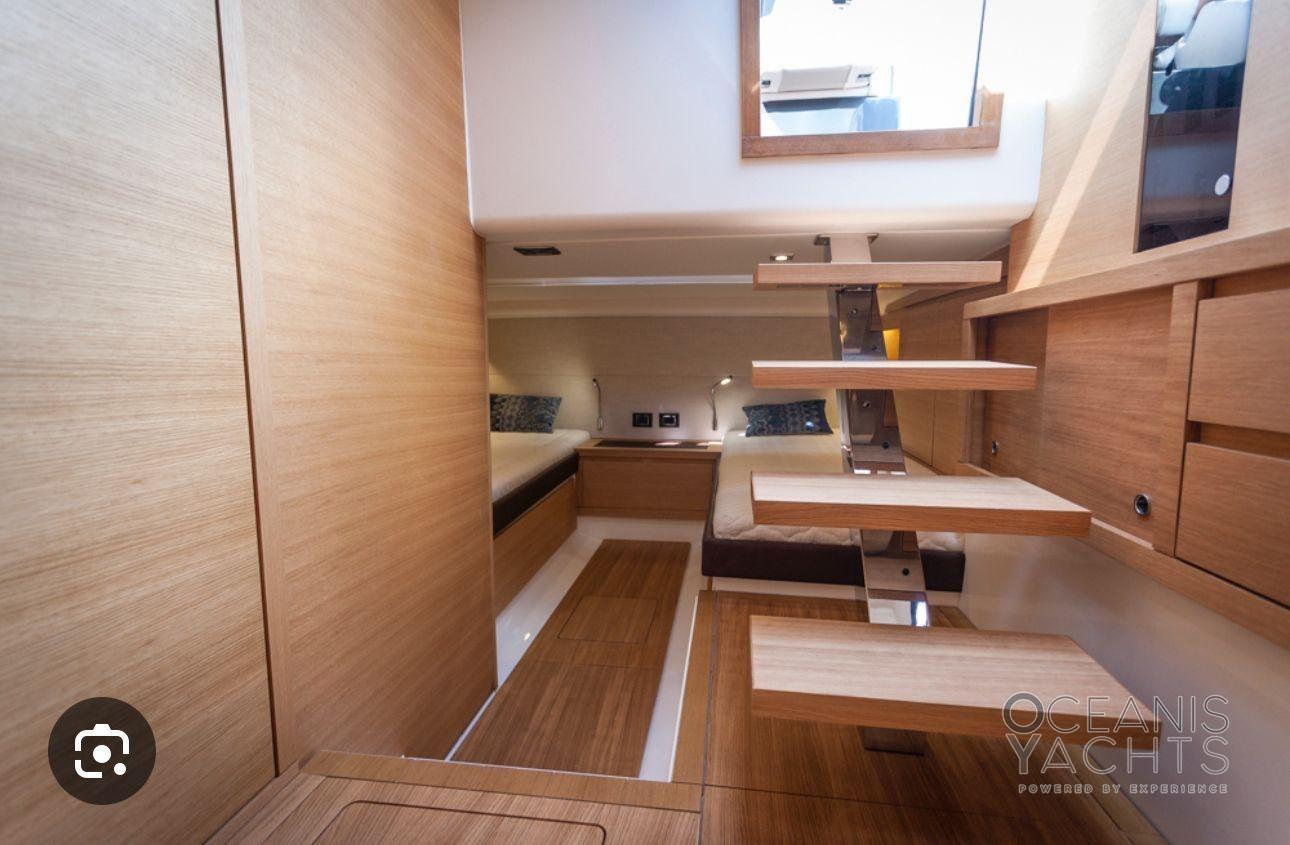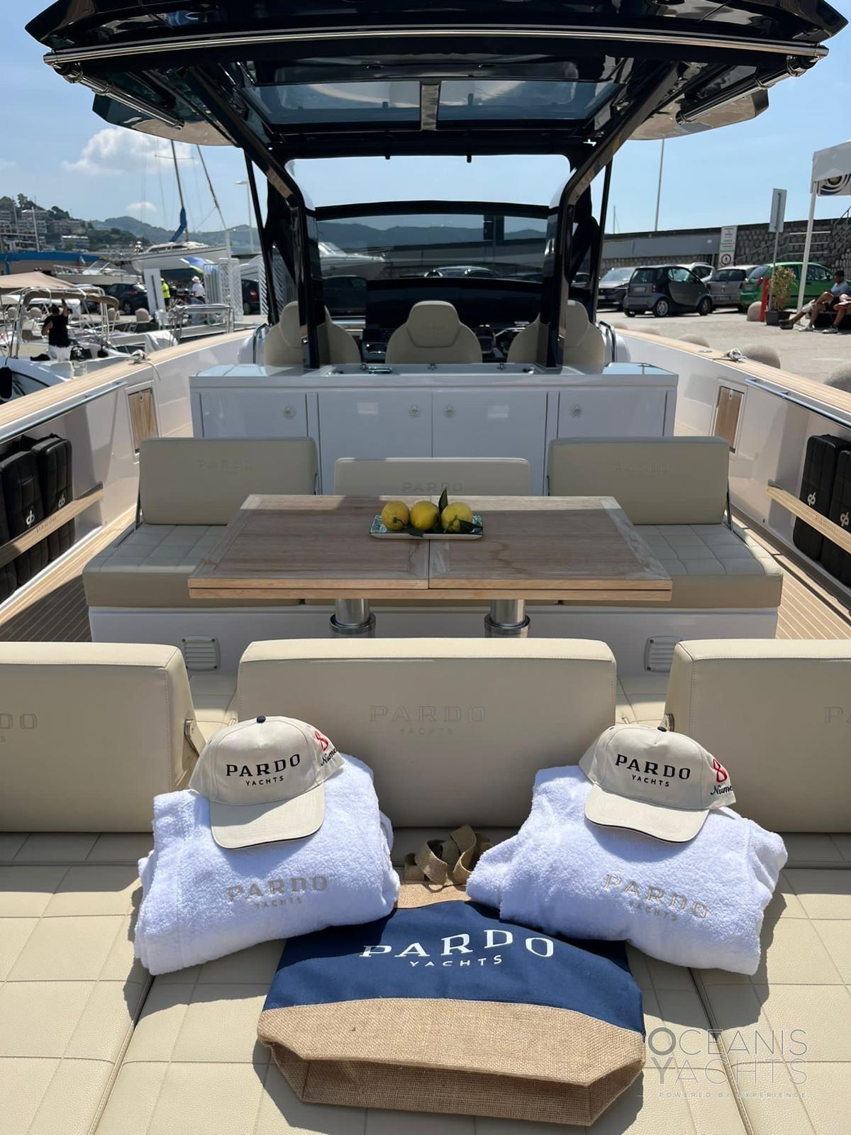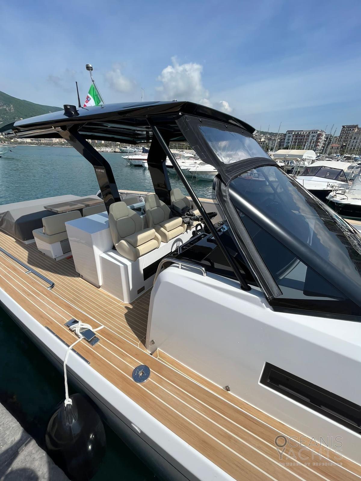 Auto Dynamic Trim Interceptor, Passavant en teck, Douche de cockpit, Garage à annexe, Lavabo dans le cockpit, Éclairage de courtoisie, Spots sous-marins, Défenses, Passerelle, Pont en teck, Cockpit en teck, Prise de quai, Connexion eau sous pression à quai, Echelle de bain, Stabilisateurs, table de cockpit, Filières avec sortie latèrale, Corne, T-Top.