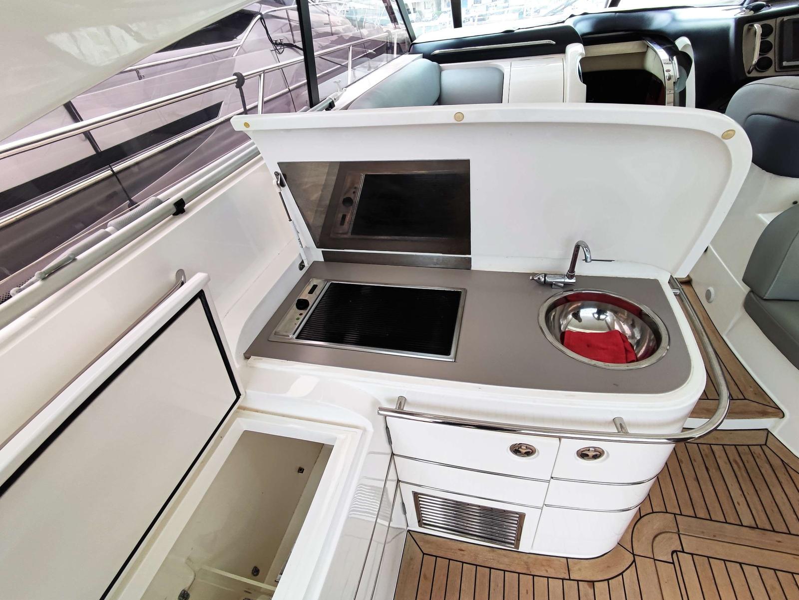 Le cockpit est vaste, coin cuisine avec réfrigérateur, plancha, congélateur et point d'eau. Grande table repas.