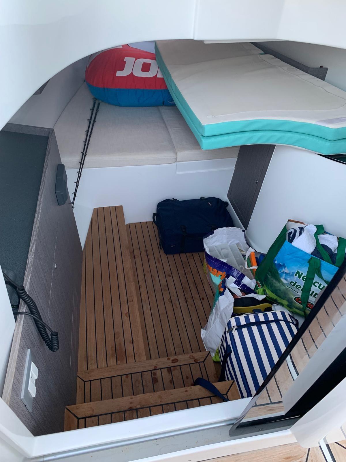 électrique, autoclave avec douche, plateforme arrière et passerelles avant recouvertes de teck. Description intérieure de la cabine avec lit double, un