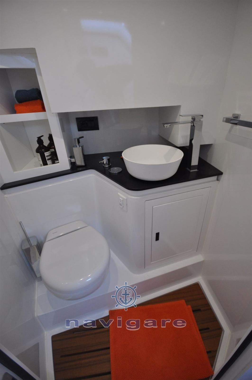 WC/SALLE de BAIN • Lavabo avec robinet d’eau chaude et froide • Douche avec eau chaude/froide* • Miroir • Toilettes électriques • Unité sous l’évier • Prise pour rasoir/sèche-cheveux 230V.• Éclairage d’ambiance • Pompe de drainage automatique. • Hublot de pont