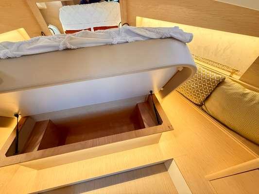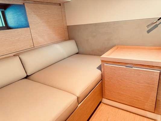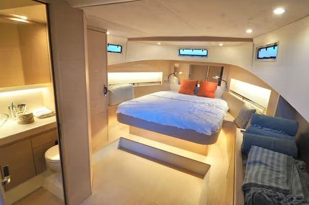 La réalisation de la menuiserie et la gestion de l’espace intérieur sont proches de la perfection, 5 personnes peuvent dormir a bord dans une ambiance chaleureuse et raffinée.