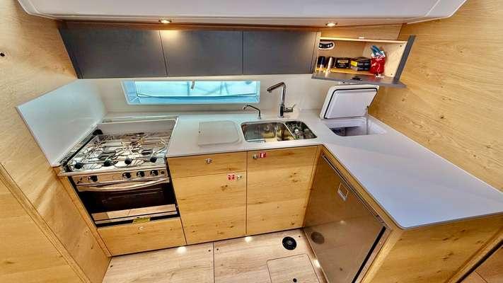 **Cuisine latérale ultra-fonctionnelle** – Grand plan de travail, cuisinière 3 feux, réfrigérateur à ouverture frontale, conservateur à ouverture par dessus.