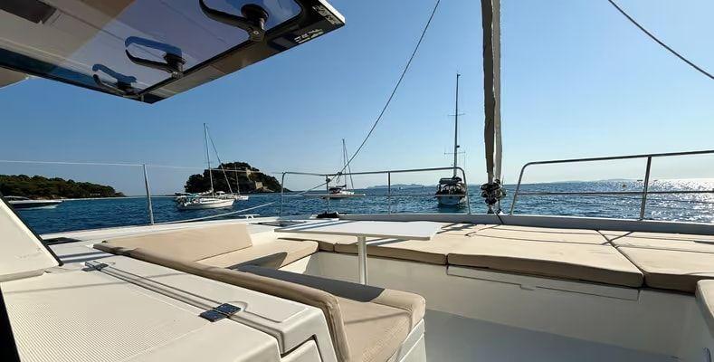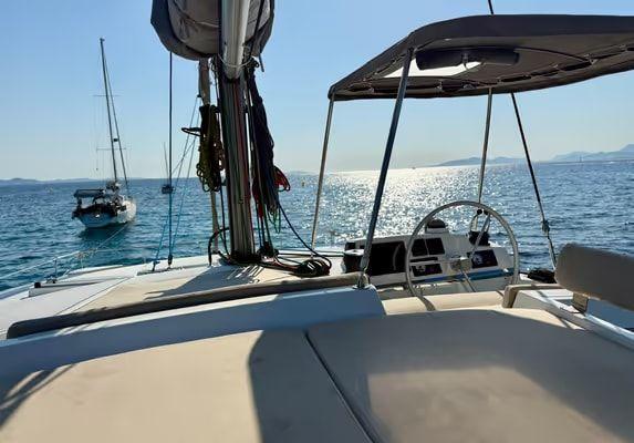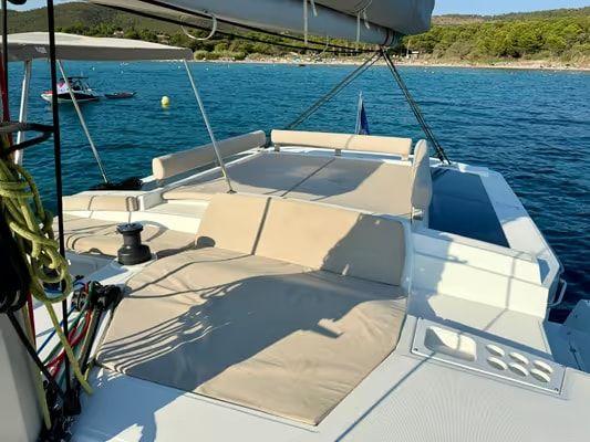 Ses voiles haute performance, son électronique Raymarine complète et ses winches électriques assurent des navigations fluides et agréables. Les vastes espaces extérieurs invitent à la détente : bains de soleil généreux sur le flybridge et le cockpit, plancha intégrée pour des moments conviviaux, et vue imprenable sur la mer pour vivre pleinement chaque escale.