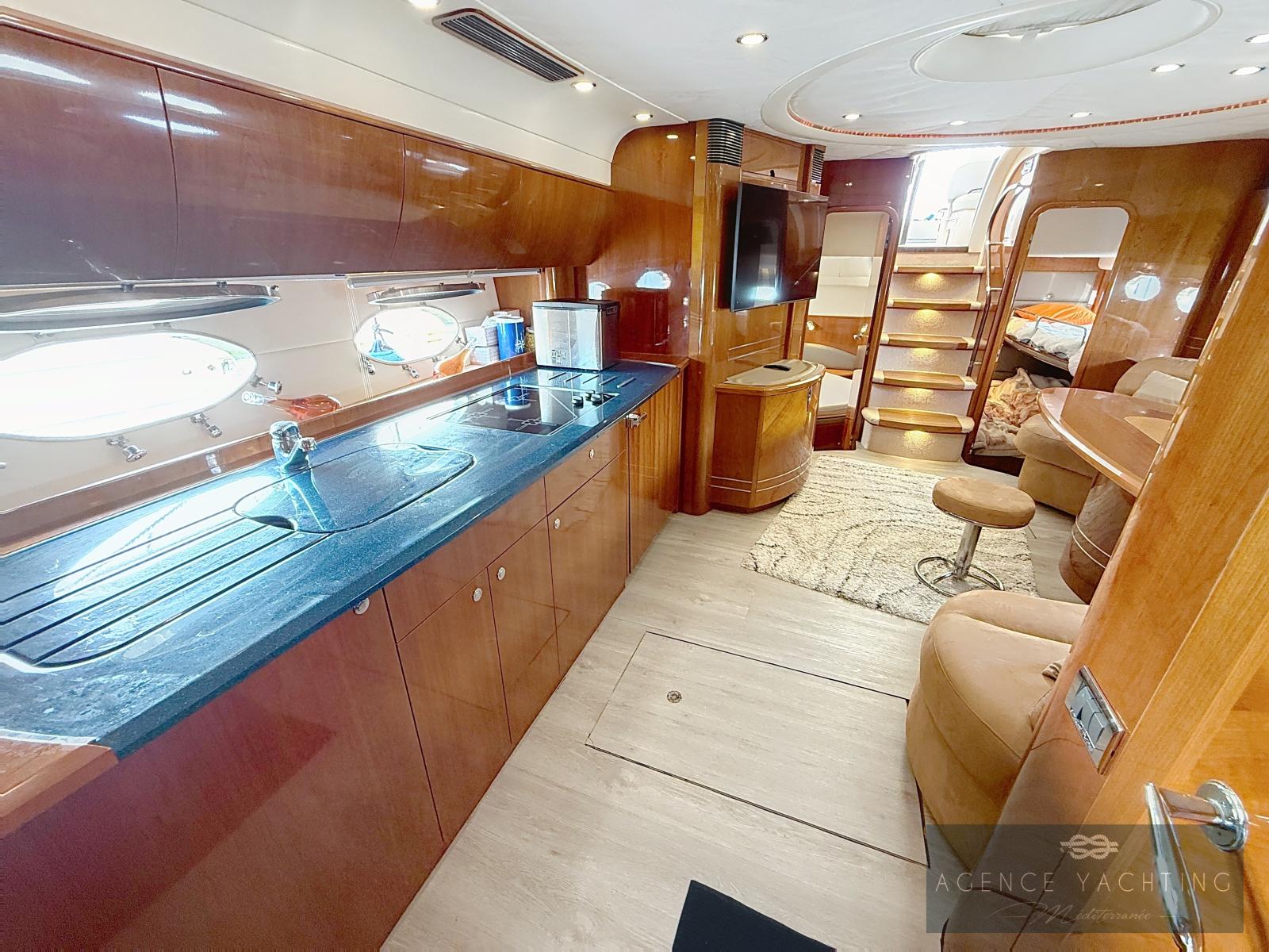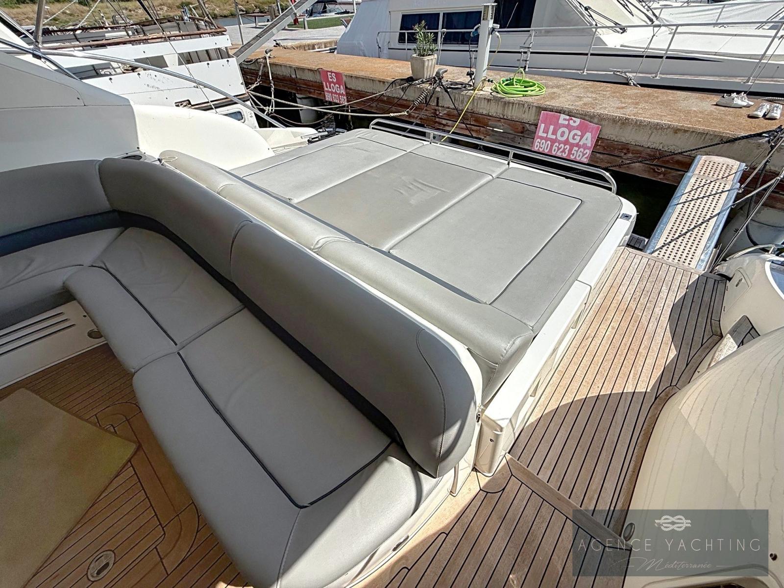 Dès l’embarquement, le yacht séduit par la fluidité de ses circulations et par la générosité de ses espaces extérieurs. La passerelle hydraulique intégrée facilite l’accès depuis le quai, tandis que la plage de bain, élégamment dessinée, ouvre sur un vaste garage à annexe surmonté d’un large bain de soleil, véritable invitation à la détente au mouillage. Le cockpit, particulièrement spacieux, est conçu comme un véritable salon extérieur : coin cuisine parfaitement intégré, grande table conviviale et selleries en parfait état créent une atmosphère à la fois raffinée et chaleureuse. Le poste de pilotage, abrité sous le hard-top, bénéficie d’une ergonomie exemplaire et d’une électronique moderne avec traceur Garmin tactile récent, garantissant une navigation précise et sereine.