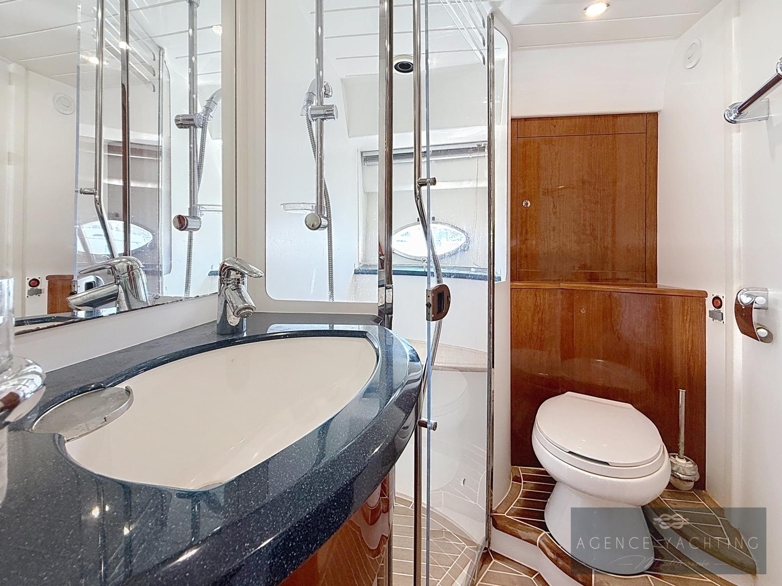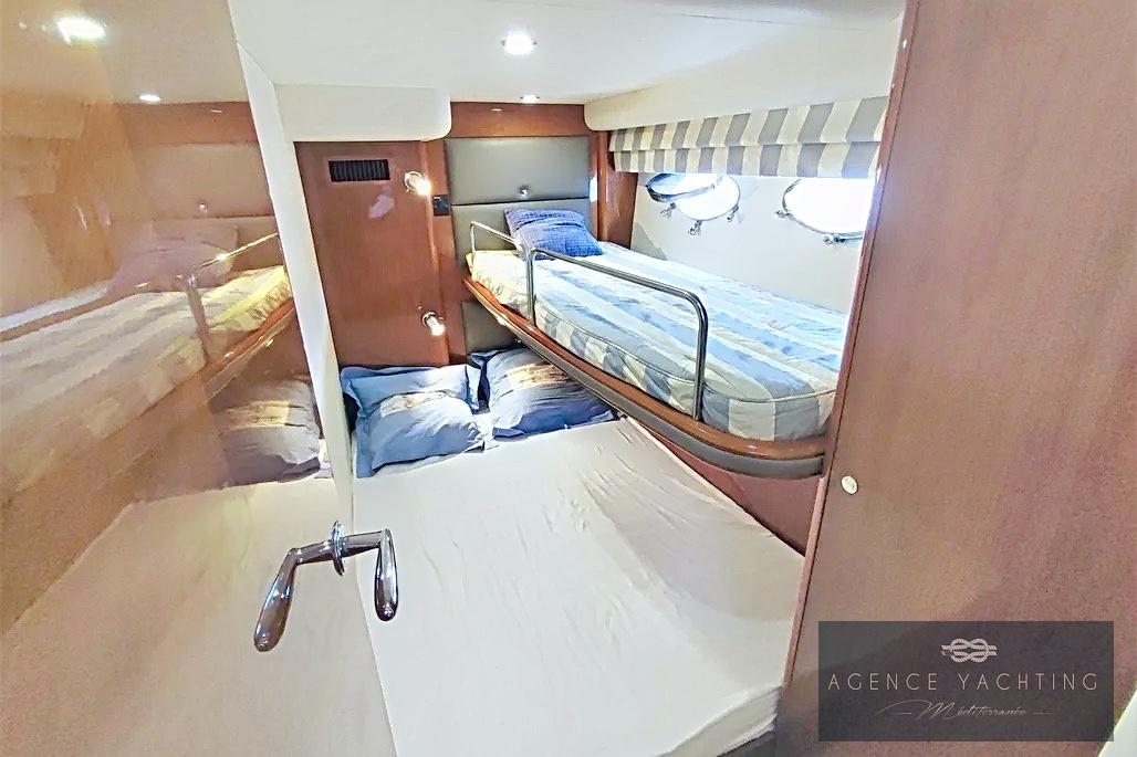À l’intérieur, l’ambiance est résolument yacht de standing. Le carré, baigné de lumière, offre un volume remarquable pour cette catégorie, avec une cuisine élégamment positionnée sur tribord. L’espace nuit se compose de trois véritables cabines, pensées pour le confort en croisière : une cabine propriétaire spacieuse à l’avant avec salle d’eau privative, une grande cabine double sur tribord disposant également de sa salle d’eau, et une cabine arrière bâbord offrant un couchage double complété par un lit simple. L’ensemble est entièrement climatisé (Réversible), y compris sous le hard-top, garantissant un confort optimal en toutes saisons.