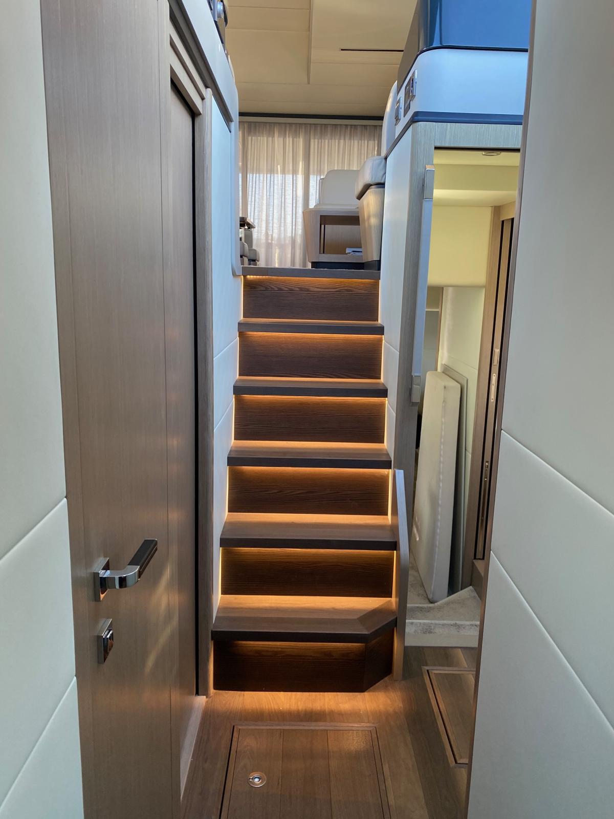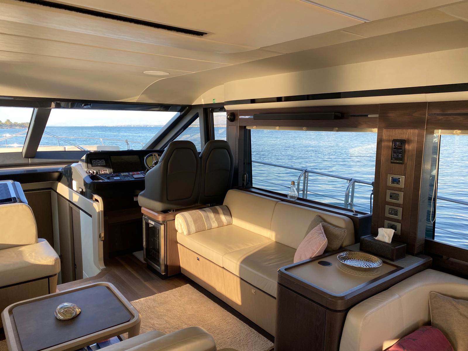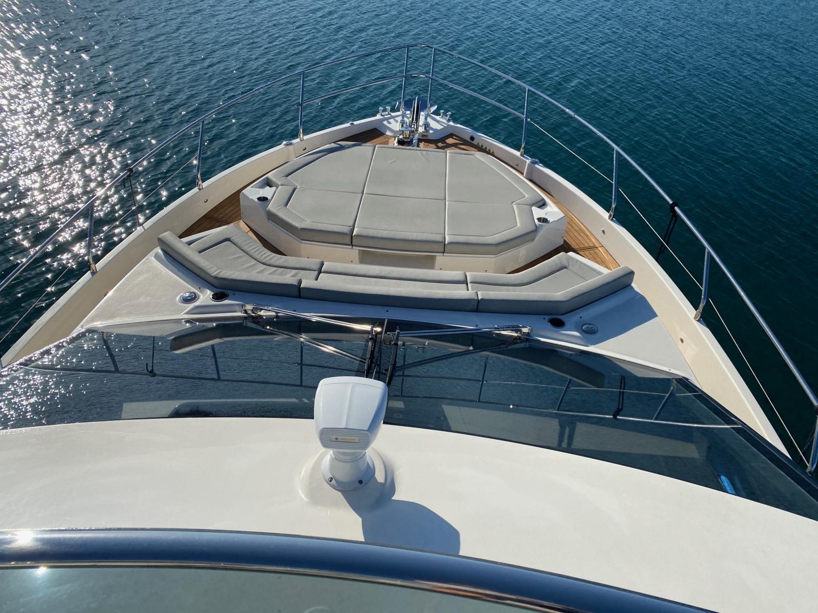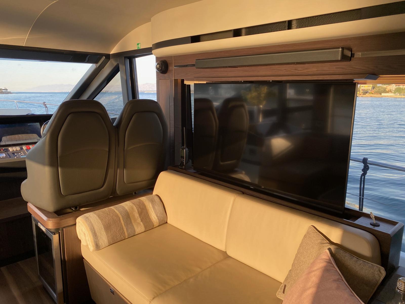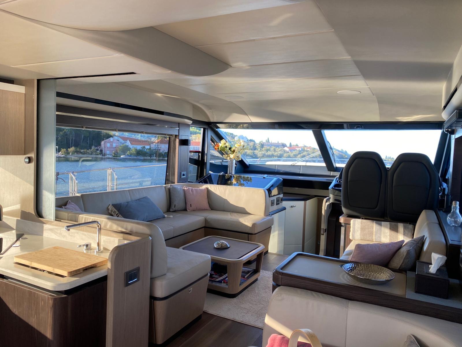 Ce modèle se distingue également par ses espaces de vie particulièrement généreux : vaste salon baigné de lumière, cuisine ouverte sur le cockpit, immense flybridge parmi les plus spacieux de sa catégorie, ainsi que de très belles zones de détente à l’avant et à l’arrière.
