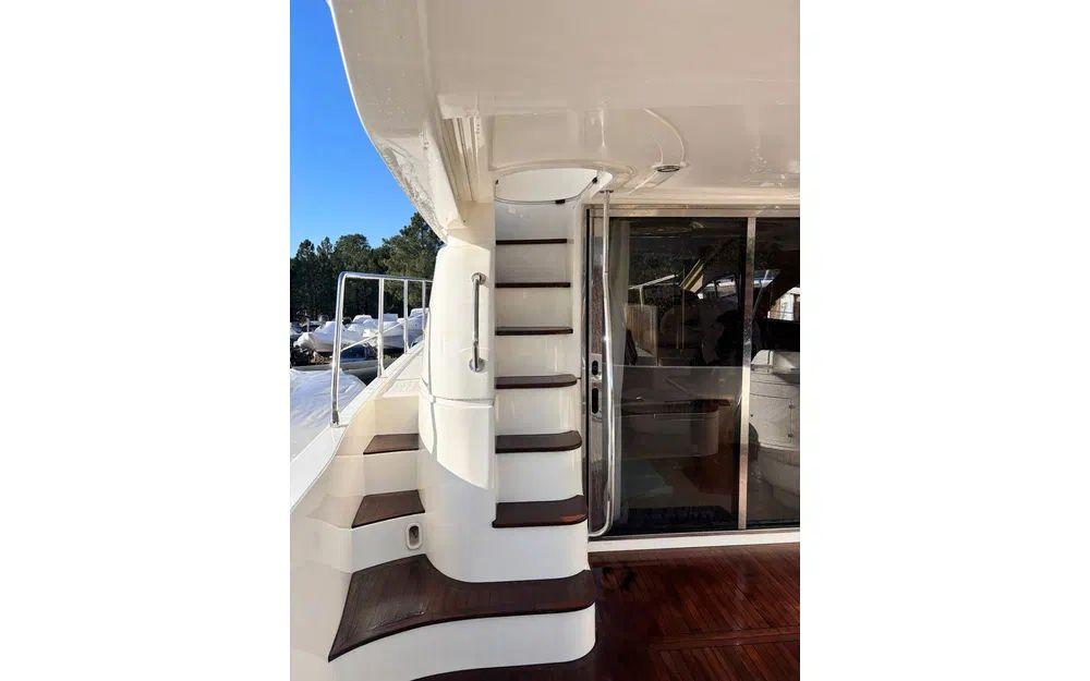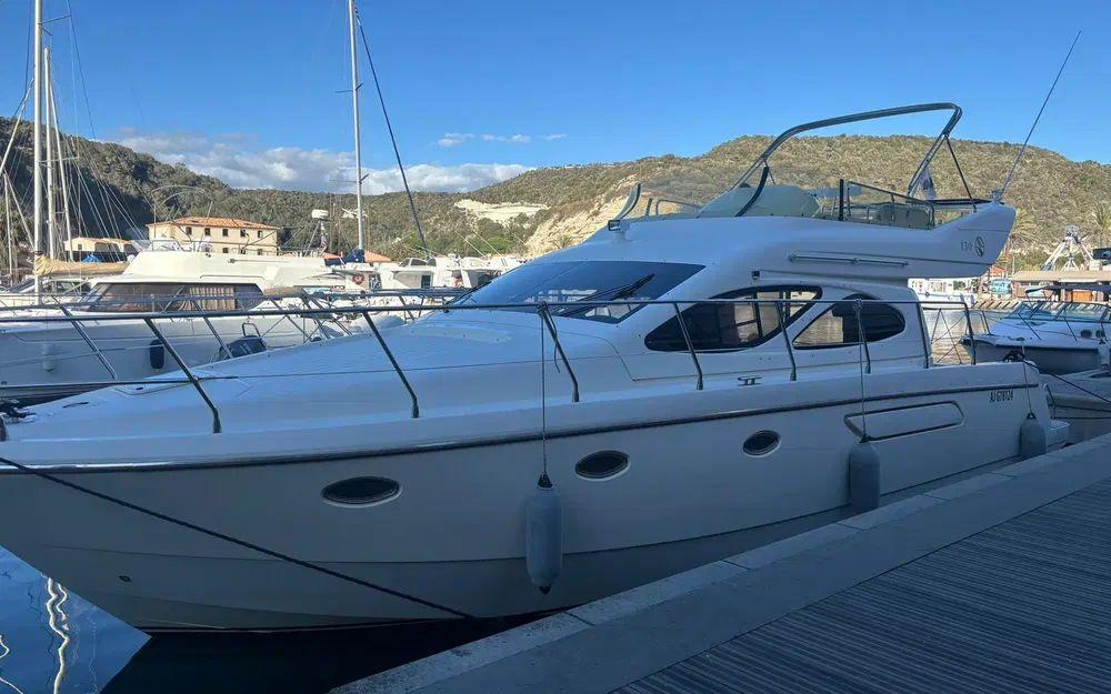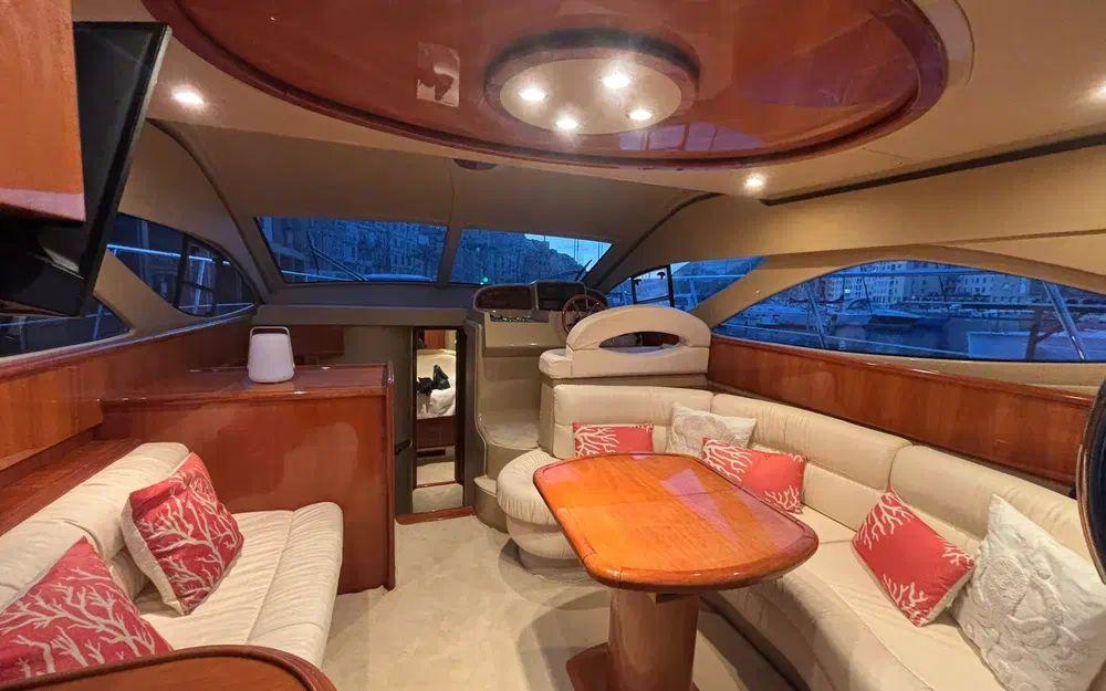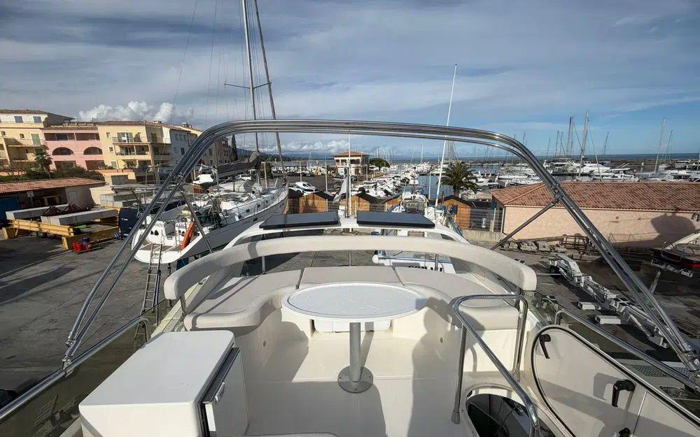 Les espaces extérieurs sont particulièrement bien pensés. Le cockpit arrière dispose d’une table et de banquettes favorisant la convivialité. À l’avant, un bain de soleil permet de profiter pleinement du mouillage. Le flybridge, doté de selleries neuves, constitue un véritable espace de vie supplémentaire. La plateforme arrière, associée à une échelle de bain et une passerelle hydraulique, facilite grandement les accès à bord et les activités nautiques.