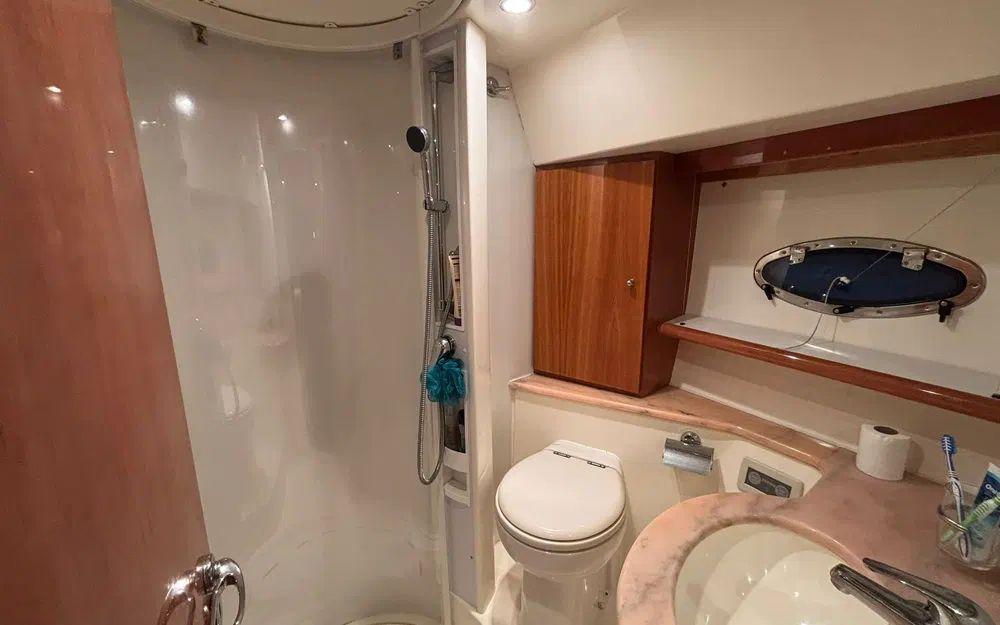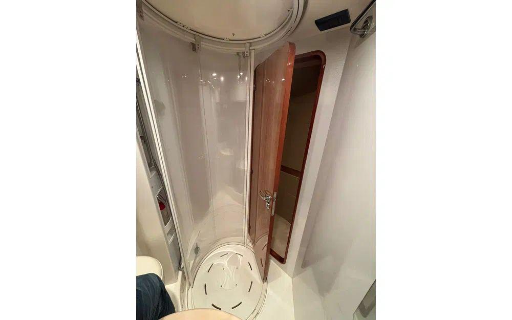 L’aménagement intérieur propose deux cabines confortables permettant d’accueillir quatre personnes, accompagnées de deux salles de bain avec WC électriques. Le carré est spacieux et lumineux, avec une cuisine entièrement équipée comprenant réfrigérateur, micro-ondes, évier et cuisinière. La climatisation réversible assure un confort optimal quelle que soit la saison.