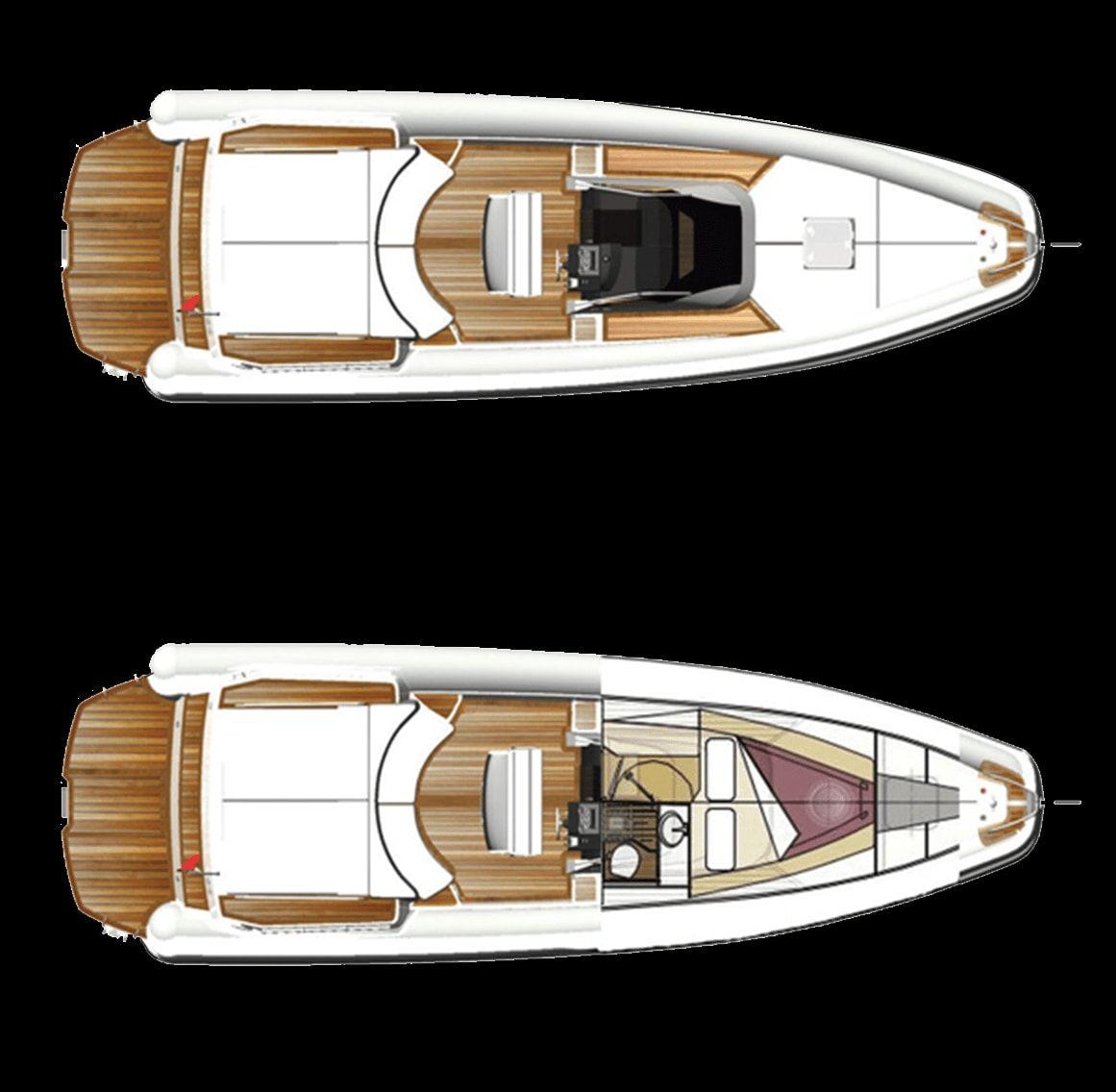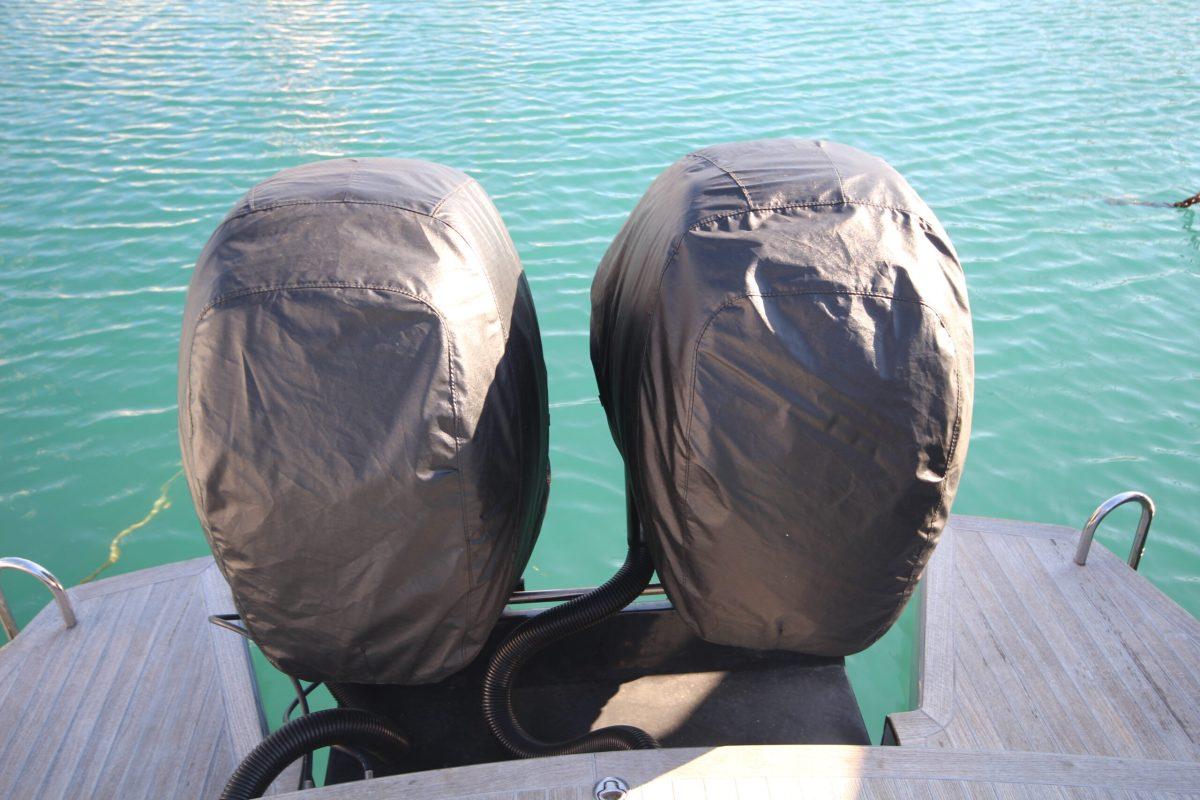 Salle de bain entièrement équipée, WC électrique, extension de bimini, mât de ski, table de cockpit, couverture d'hiver, couvertures de moteurs, VHF, système de navigation, guindeau électrique