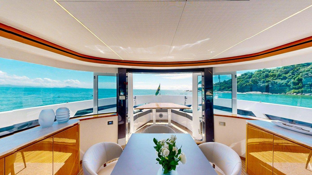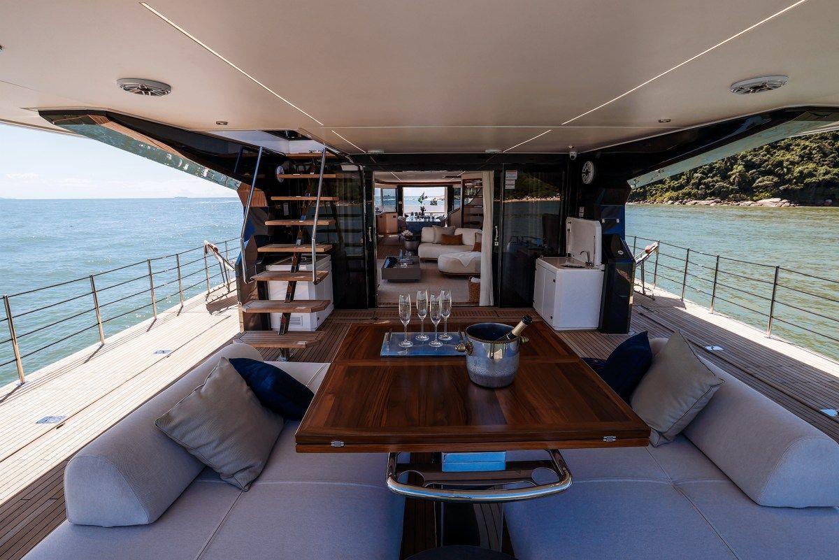 L'Okean 80 dispose de portes de pont entièrement ouvrantes, créant une superbe terrasse panoramique. Cette zone spacieuse permet à jusqu'à 30 invités de profiter de la mer avec style. Le pont offre beaucoup d'espace pour la détente, le repas, et les interactions sociales. C'est l'endroit parfait pour des moments mémorables en famille et entre amis.