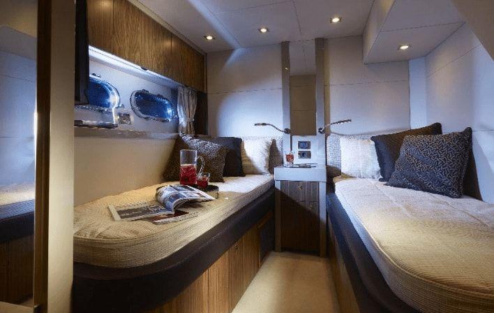 À l'intérieur, le Predator 62 impressionne par ses matériaux de haute qualité, son style contemporain et sa disposition intelligemment planifiée. Le salon dispose de fenêtres panoramiques et de sièges luxueux, tandis que la cuisine entièrement équipée et les trois cabines avec salle de bain privative offrent tout le confort d'une maison de luxe en mer.