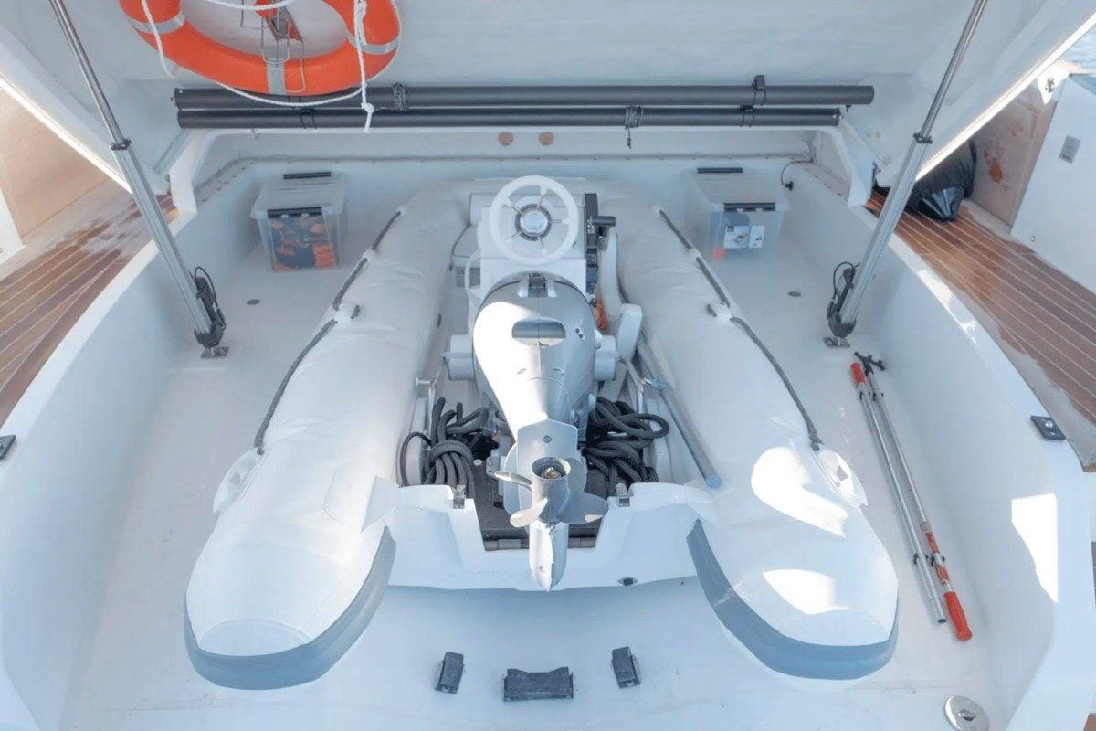 Un aménagement soigneusement pensé : les volumes sont généreux, trouvant un rare équilibre entre apparence sportive et élégance. La coque, héritée de l'expertise de Solaris Yachts, offre une excellente tenue en mer, même par temps agité.