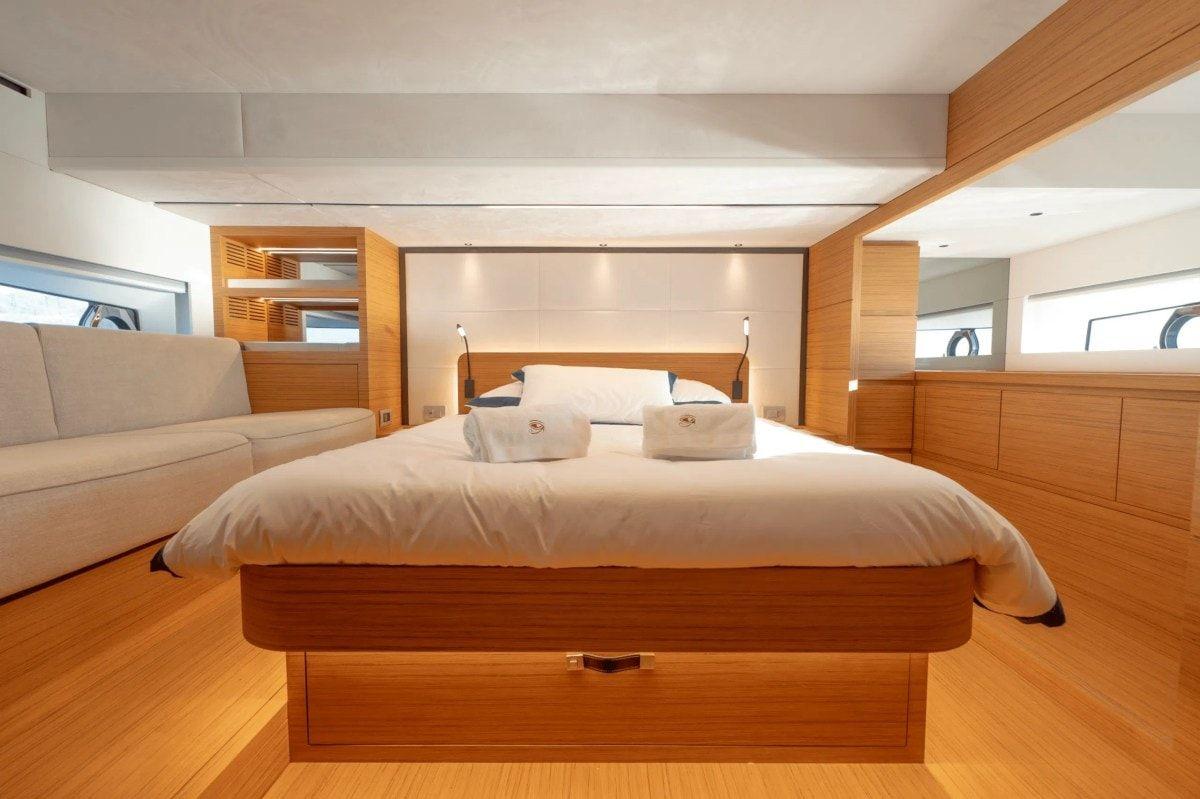 Cette version offre 2 cabines et 2 salles de bains, avec des finitions haut de gamme et une véritable attention aux détails. L'intérieur est baigné de lumière naturelle, avec un mélange réussi de design italien et de confort moderne.