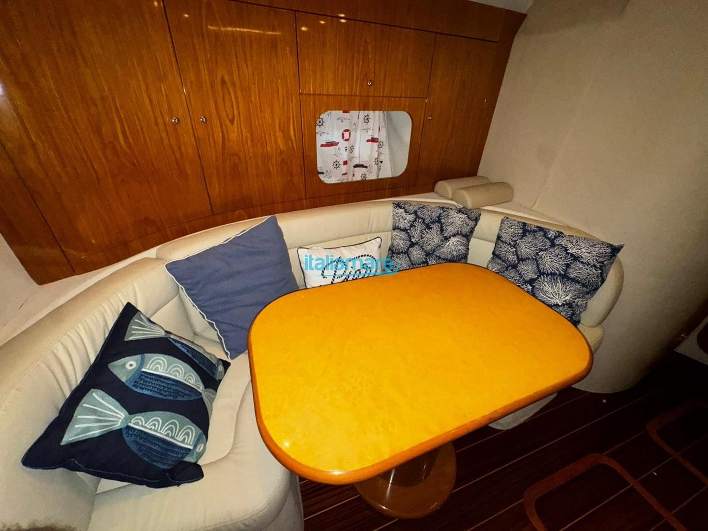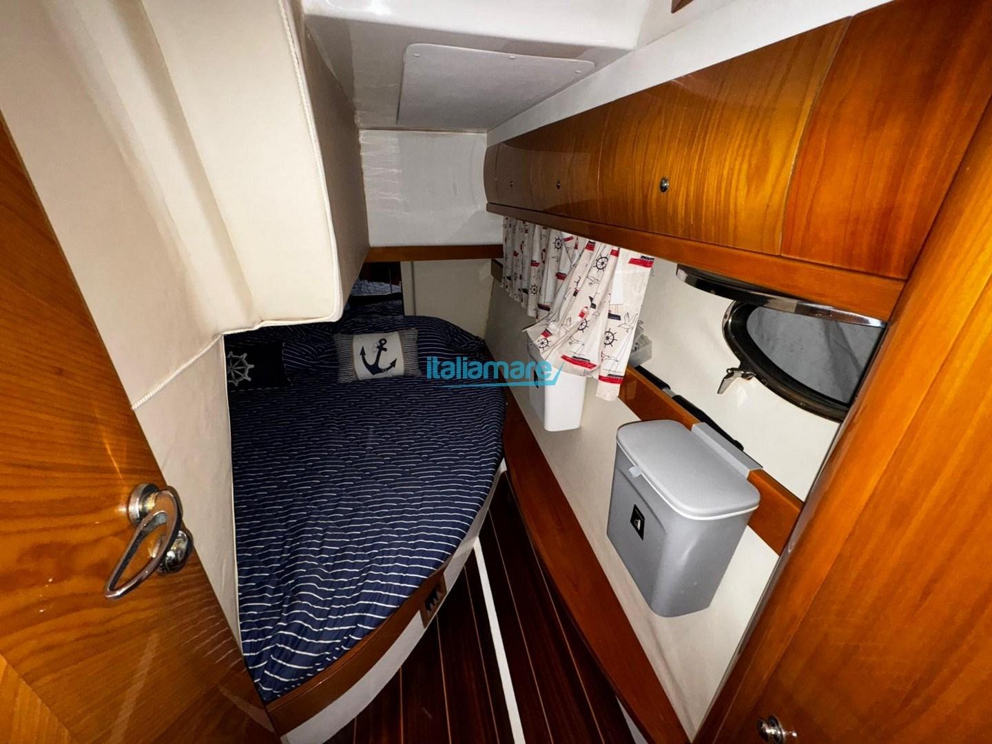 Sous le pont, elle propose trois cabines séparées et deux couches, conservant une grande hauteur de tête sur toute la surface et une dinette lumineuse généralement revêtue en bois de cerisier classique.
