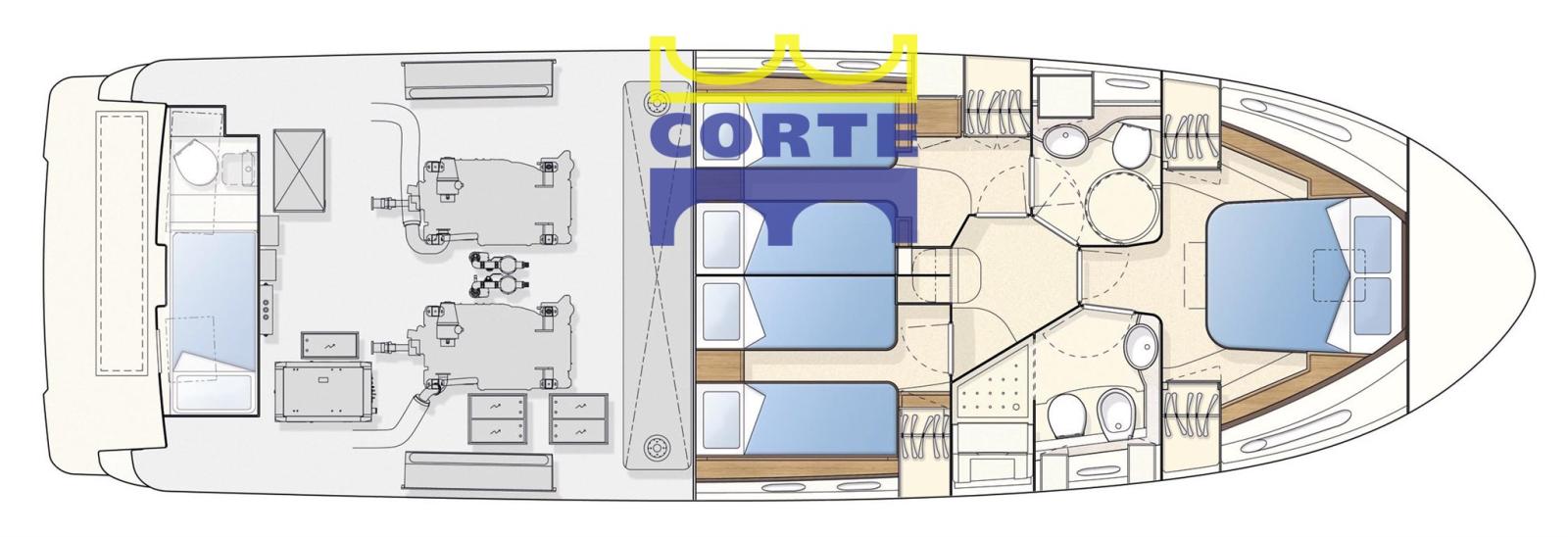 Double cabine principale à l’avant, deux cabines avec lits simples, deux salles de bains. Cabine équipage avec salle de bain, actuellement avec machine à laver et dessalinisateur