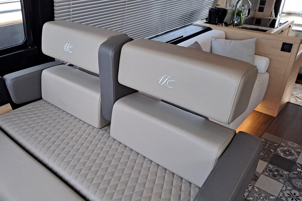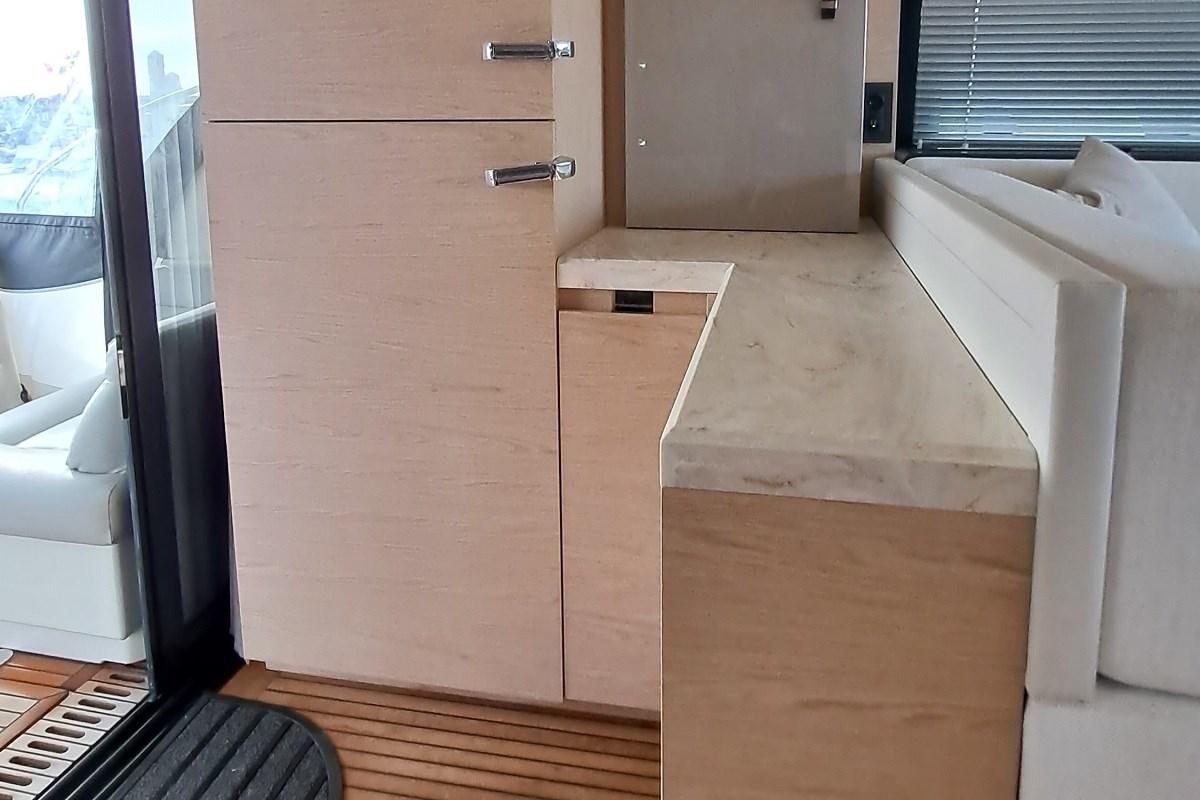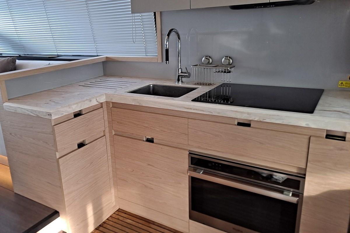 Pont principal avec cuisine stratégiquement positionnée entre le cockpit et le salon. En ouvrant la fenêtre, un espace convivial unique est créé. Il est équipé d’une plaque en céramique, d’un four, d’un réfrigérateur avec colonne congélateur et d’un espace de rangement suffisant. Vers la proue se trouve le salon avec un grand canapé en forme de « U » et une table à manger. Les immenses fenêtres latérales offrent une vue à 360° et beaucoup de lumière naturelle. La station de timon, située sur tribord, intègre le système de contrôle du navire avec des affichages Garmin pour une gestion totale du bateau.