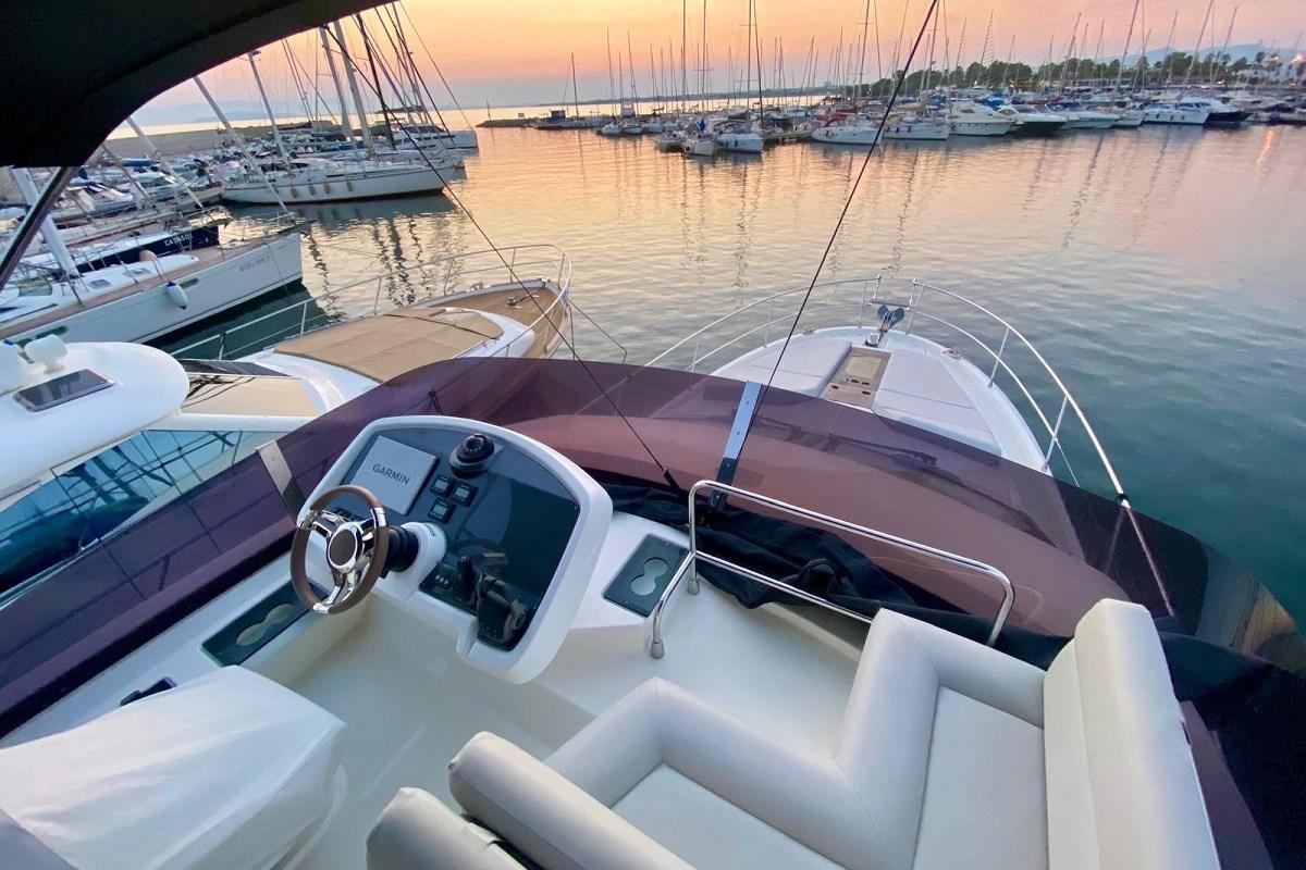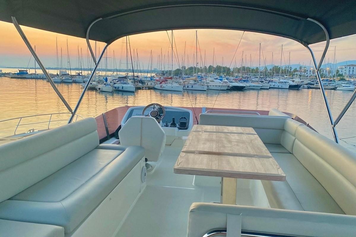 Flybridge, l’un des plus spacieux de sa catégorie, avec une timonerie située à l’avant sur la gauche, et l’instrumentation complète est connectée au contrôle du navire. Espace salon avec un grand canapé en forme de « U » à l’arrière avec une table en teck pouvant accueillir jusqu’à 8 personnes. Bar humide équipé d’un barbecue électrique, d’un évier et d’un réfrigérateur. Pont solaire avec de grands coussins à côté de la timonerie