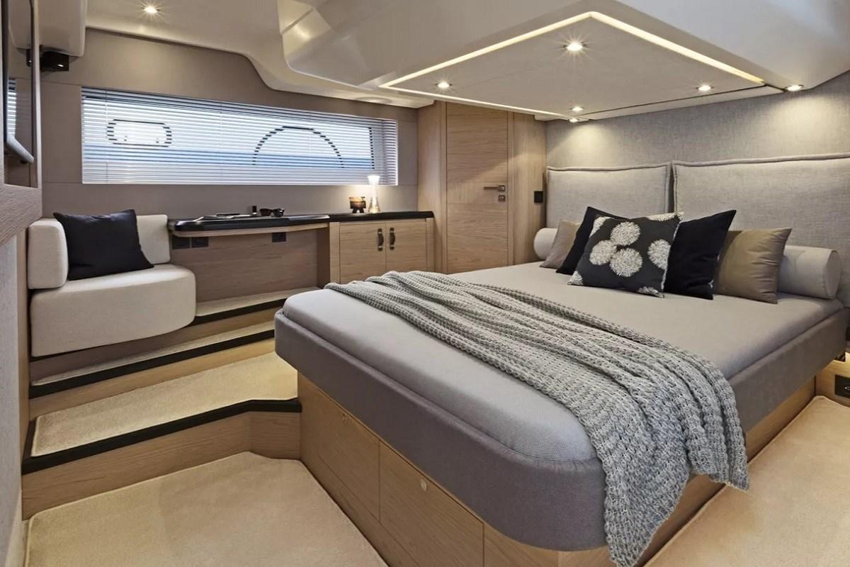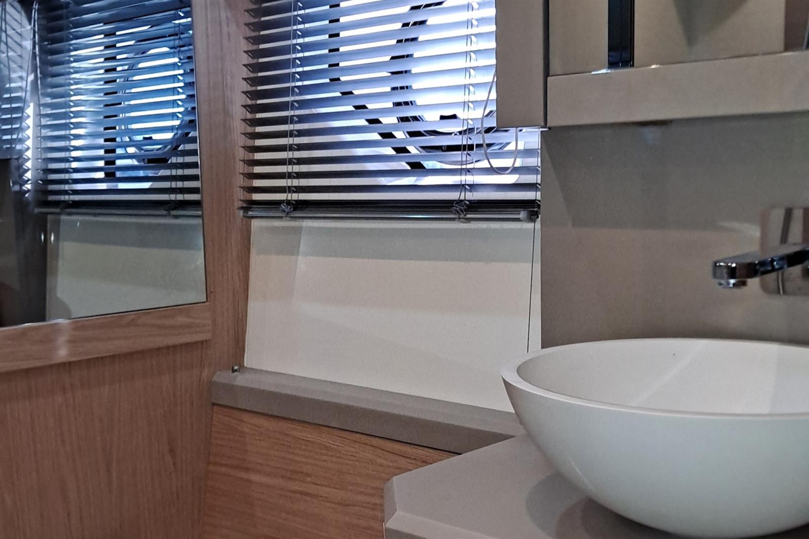 Pont inférieur avec cabine principale pleine poutre au centre du navire avec lit double îlot, grandes fenêtres de coque, un bureau/coiffeuse et une salle de bain attenante avec douche séparée. Cabine VIP à l’avant, très lumineuse, avec un lit double (convertible en deux chambres simples en « V ») et accès direct à la deuxième salle de bain. Cabine d’accueil tribord équipée de deux lits simples côte à côte. La deuxième salle de bain, située à gauche, sert de salle de bain pour la cabine VIP et pour la cabine d’amis (salle de bain de jour)