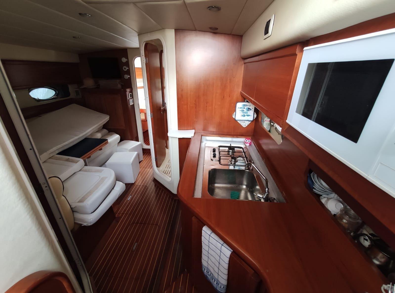 Alarme moteur, Alarme de pompe de cale, Alternateur, Eau sous pression, Douche de cockpit, Flaps hydrauliques, Extincteur(s) fixe(s), Éclairage de courtoisie, Passerelle (IDRAULICA), Plateforme arrière, Pompe de cale automatique, Pompe de cale manuelle, Cockpit en teck, Prise de quai, Guindeau électrique, table de cockpit, Table pliante de salon, Corne.
