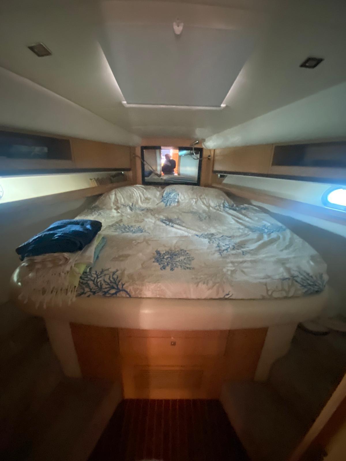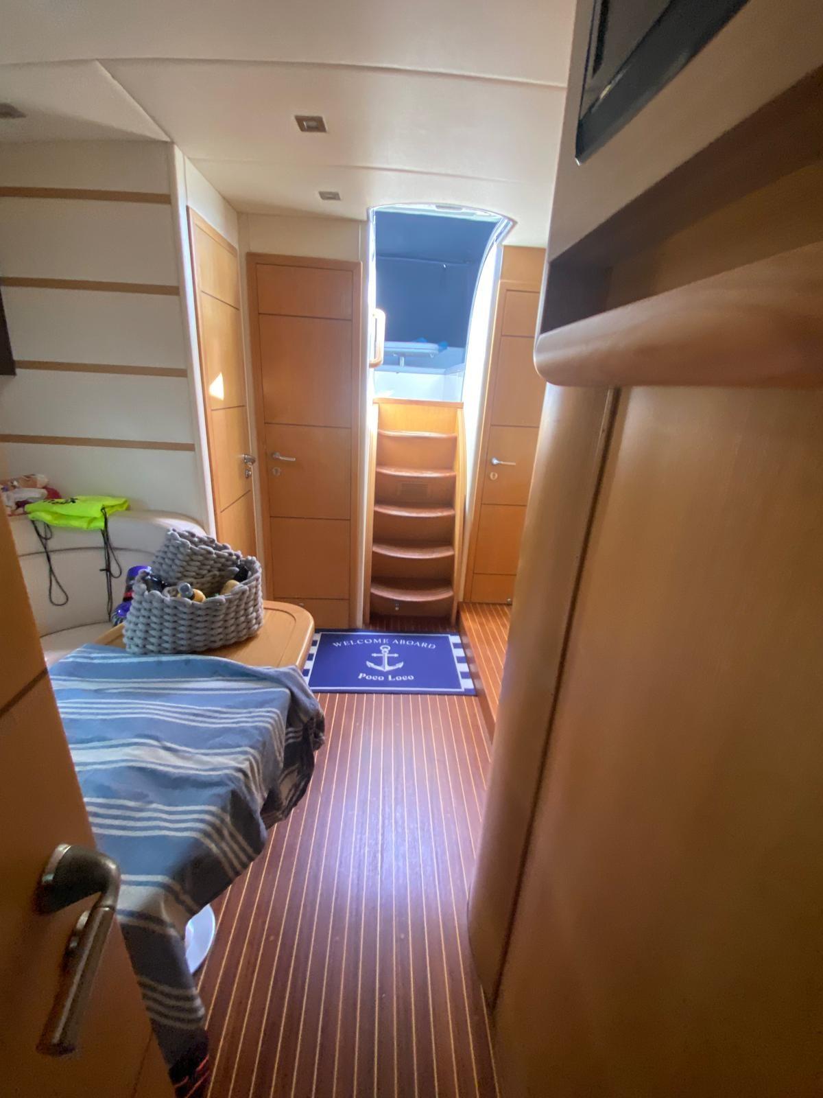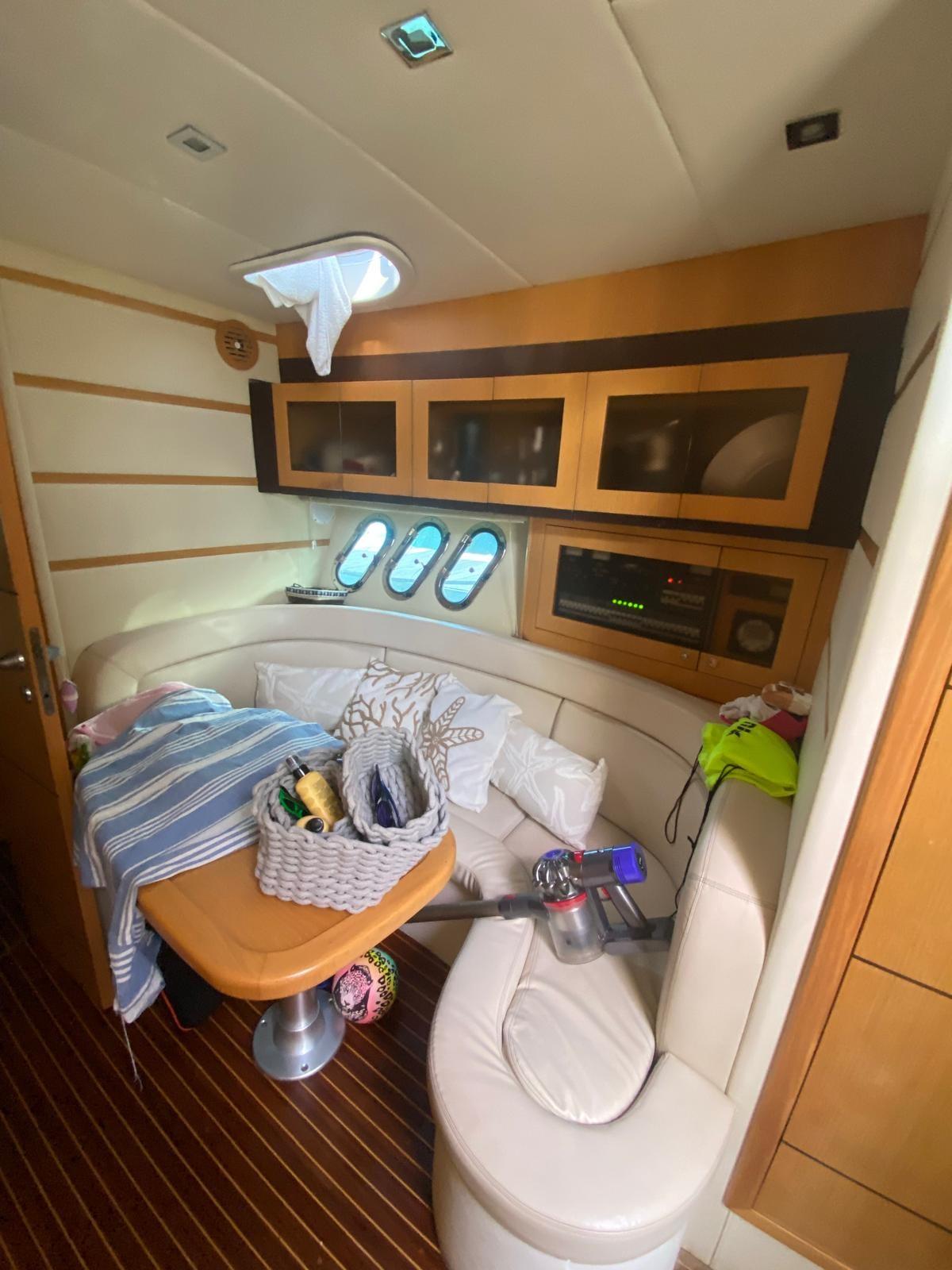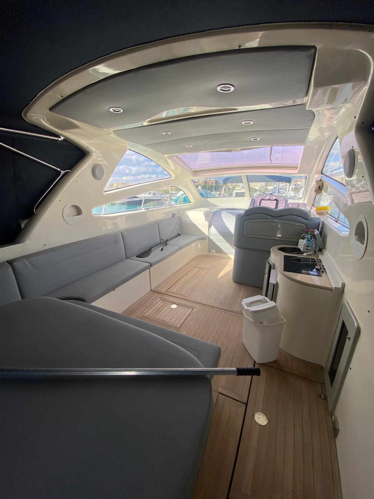 Alarme moteur, Alarme de pompe de cale, Ouverture du compartiment moteur électrique, Eau sous pression, Douche de cockpit, Phare de poursuite, Flaps hydrauliques, Hard top, Extincteur(s) fixe(s), Indicateurs de flaps, Lavabo dans le cockpit, Éclairage de courtoisie, Spots sous-marins, Plateforme arrière, Pompe de cale manuelle, Cockpit en teck, Prise de quai, Connexion eau sous pression à quai, Guindeau électrique, Echelle de bain, table de cockpit, Table pliante de salon, Annexe, Corne.