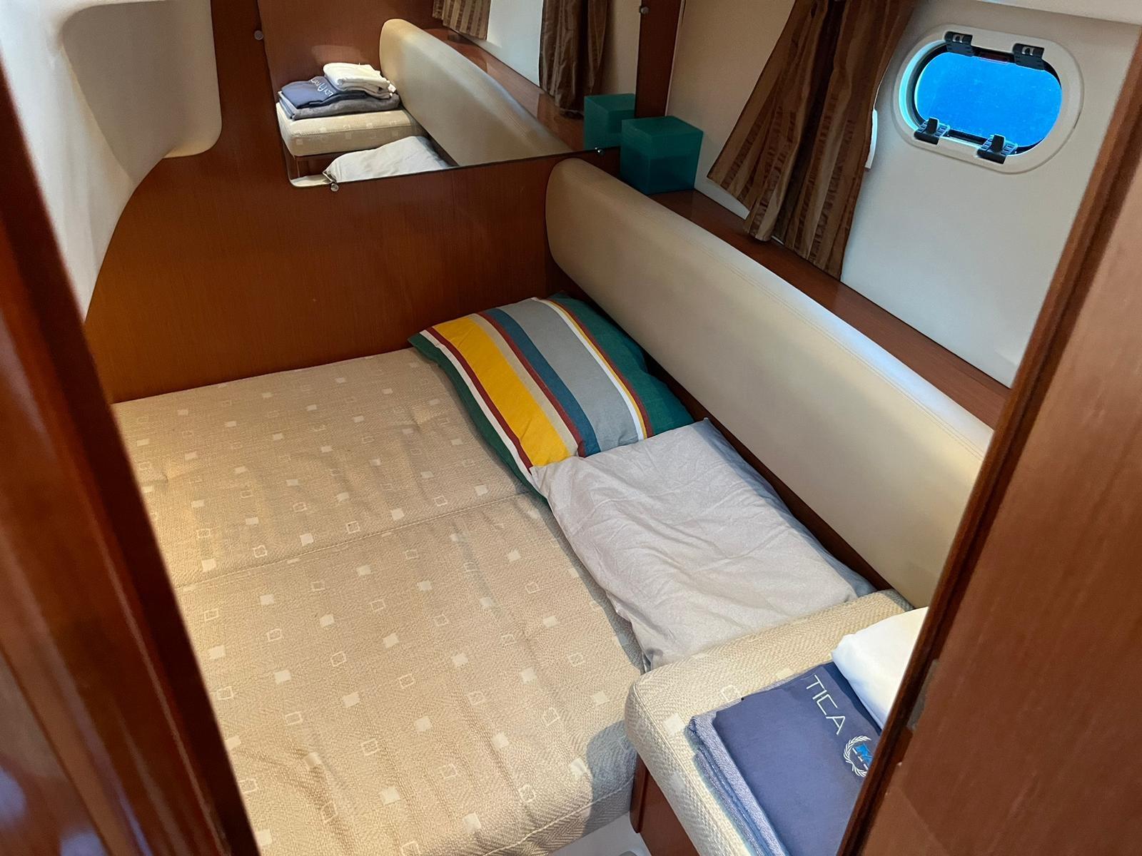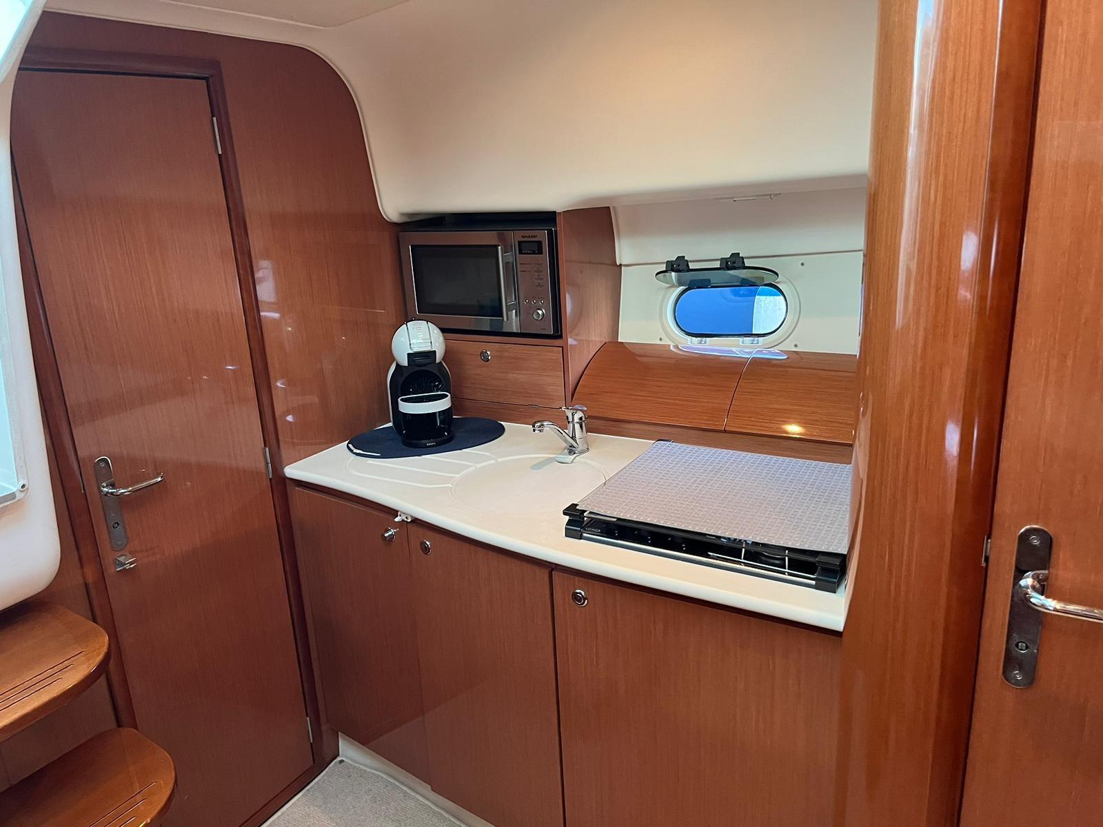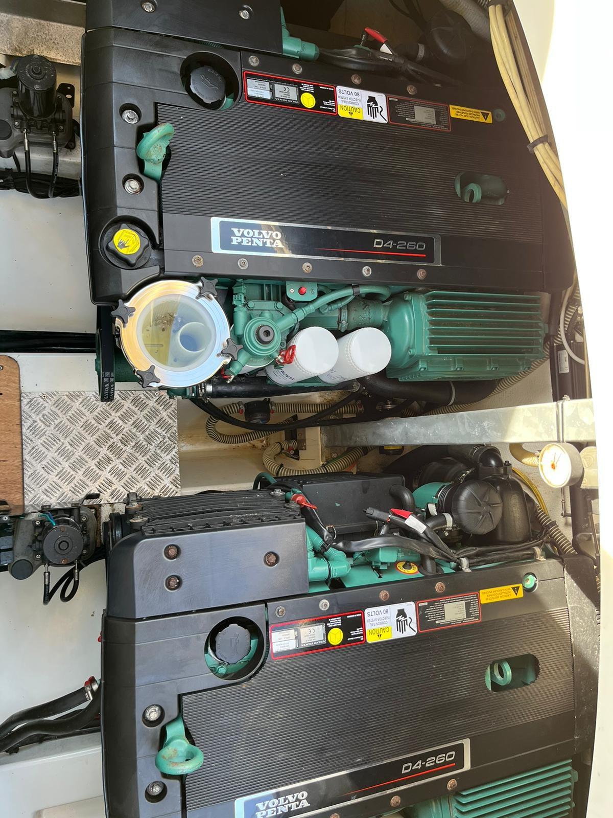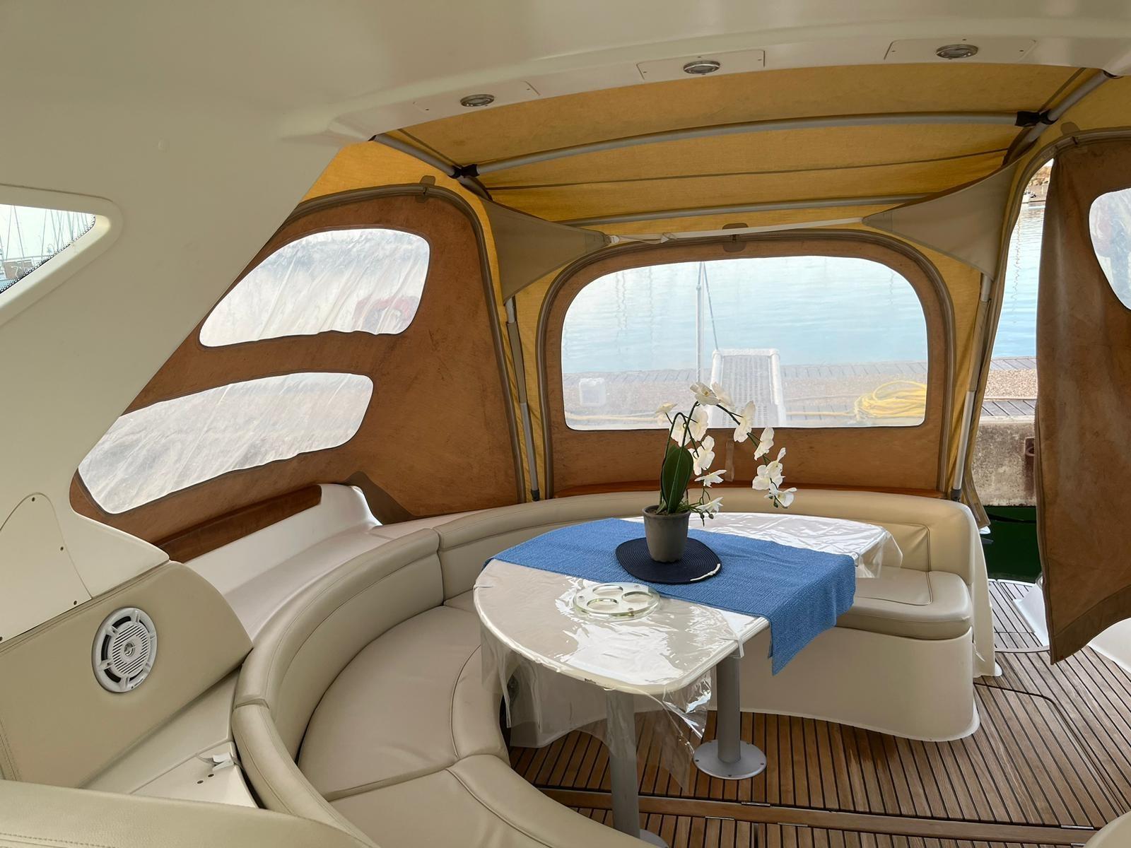 Alarme moteur, Eau sous pression, Douche de cockpit, Flaps hydrauliques, Hard top, Lavabo dans le cockpit, Éclairage de courtoisie, Plateforme arrière, Pompe de cale automatique, Pompe de cale manuelle, Cockpit en teck, Prise de quai, Connexion eau sous pression à quai, Rollbar, Guindeau électrique, Selles pour Annexe, table de cockpit, Table pliante de salon, Annexe, Corne.