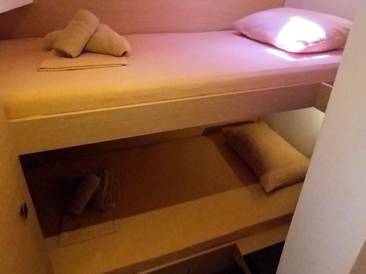 1 CABINE D’ÉQUIPAGE À LA PROUE DROITE AVEC SALLE DE BAIN À LA PROUE GAUCHE