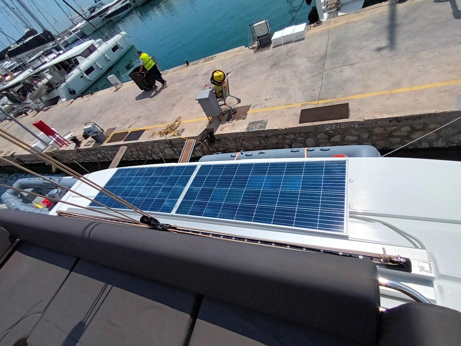 Alarme moteur, Alarme de pompe de cale, Alternateur, 2 Ancre (32 kg con 82 m di catena + ancora con 20 m di catena), Eau sous pression, Douche de cockpit, Moteur hors-bord pour annexe (HONDA 6hp), 2 Panneau solaire (150W), Passerelle (idraulica 3 m), Plateforme arrière, Pompe de cale automatique, Porte latérale, Cockpit en teck, Prise de quai, Connexion eau sous pression à quai, Guindeau électrique, Gréement monotoron, Echelle de bain, table de cockpit, Annexe (3.60 m), Windex.
