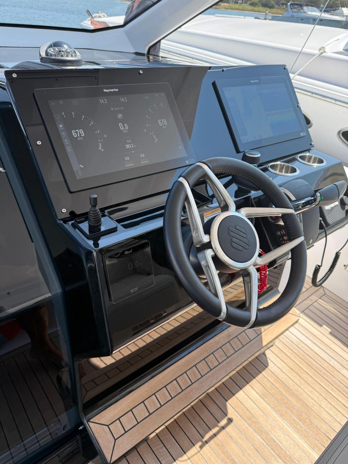 Indicateur d'angle de barre, Ordinateur fixe de bord, Compteur de chaîne, Moniteur, Joystick, Plotter GPS (RAYMARINE n. 2 monitor da 16"), Siège copilote.
