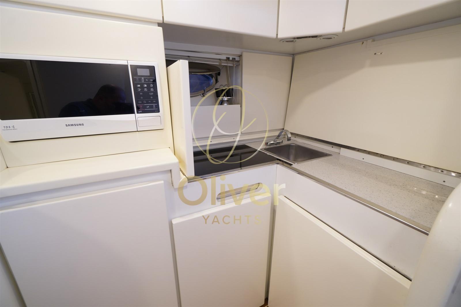 La cuisine entièrement équipée et intégrée est conçue pour un usage de croisière réelle, offrant une praticité sans compromettre l’espace de vie.