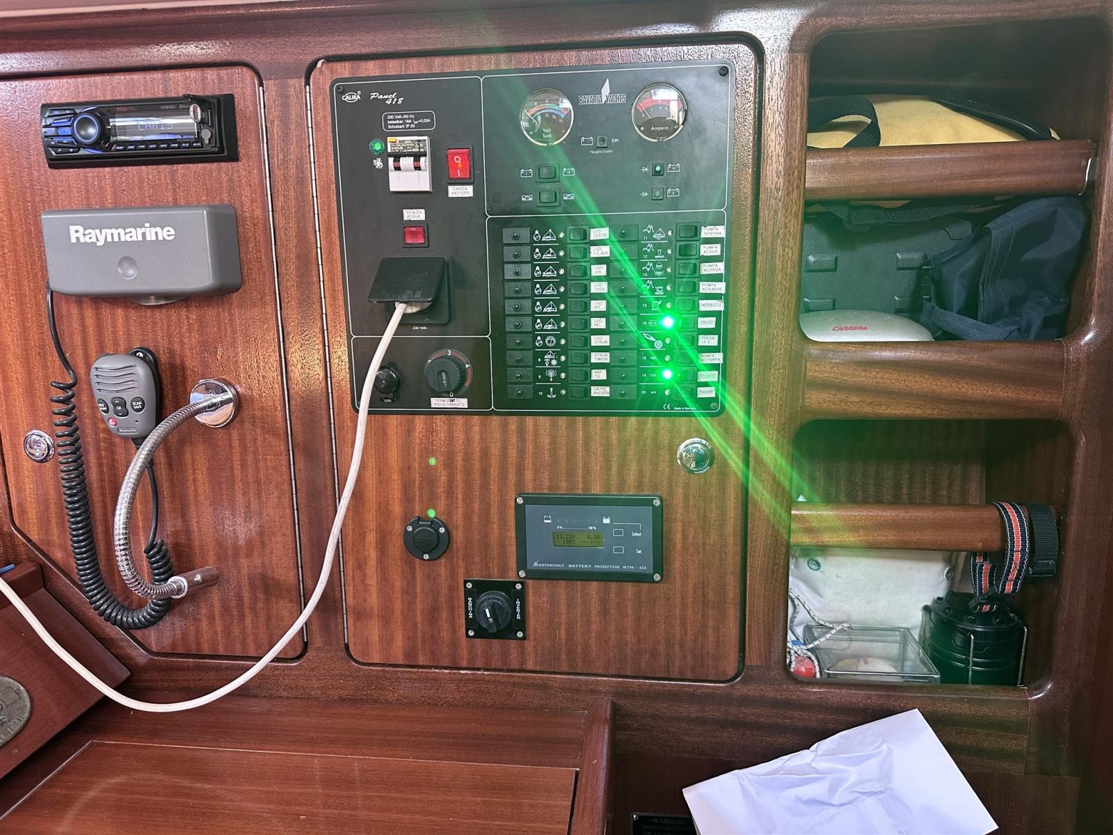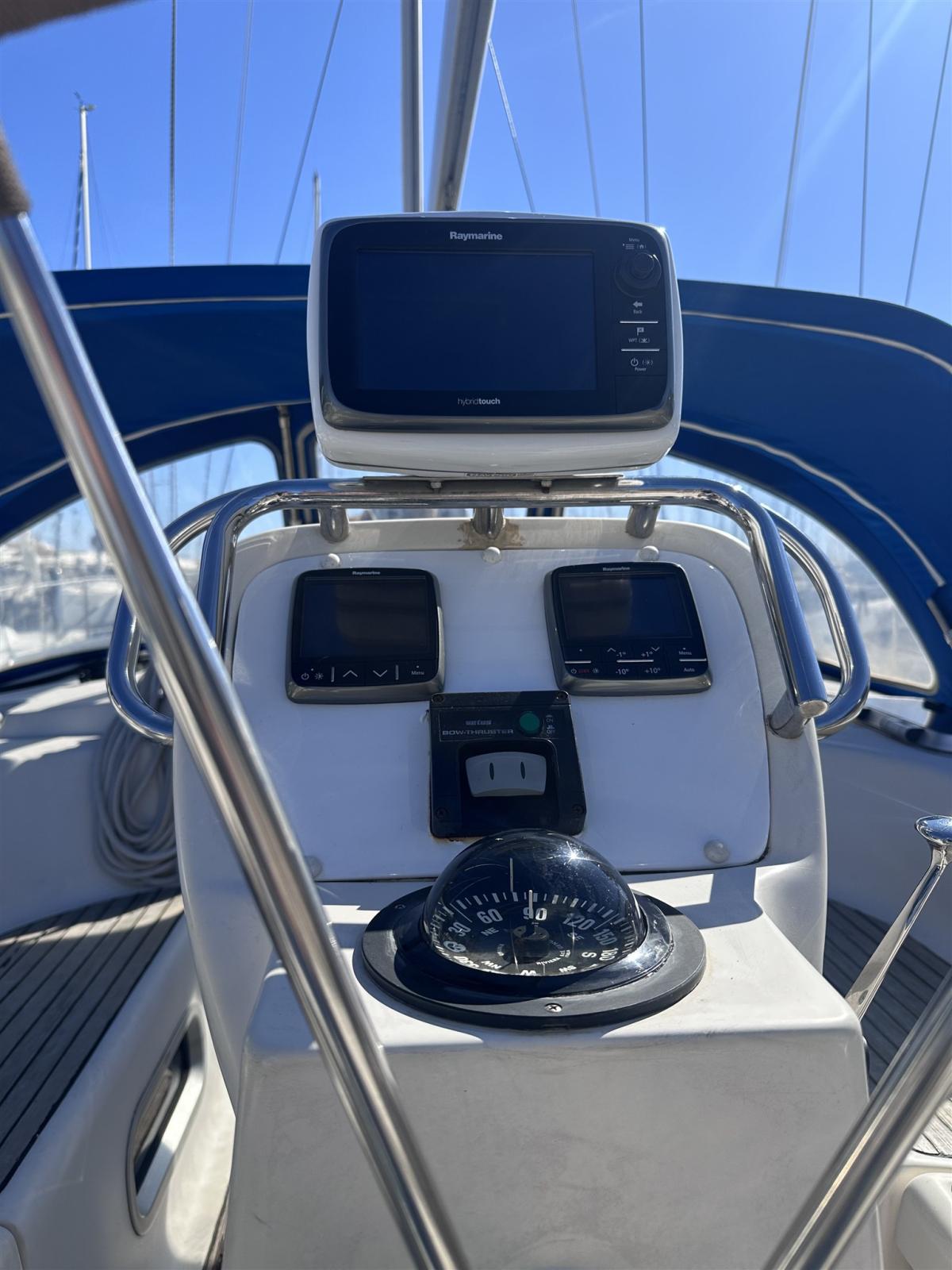 Antenne radar (Raymarine), Compteur de chaîne (Radiocomando Quick), Loch (Raymarine I 70), Sondeur pêche (Raymarine I 70), GPS (Raymarine), Pilote automatique (Rayamrine EV 200), Radio VHF (Raymarine D55 con cornetta esterna), Anémomètre/Girouette (Raymarine con scheda del 2025).