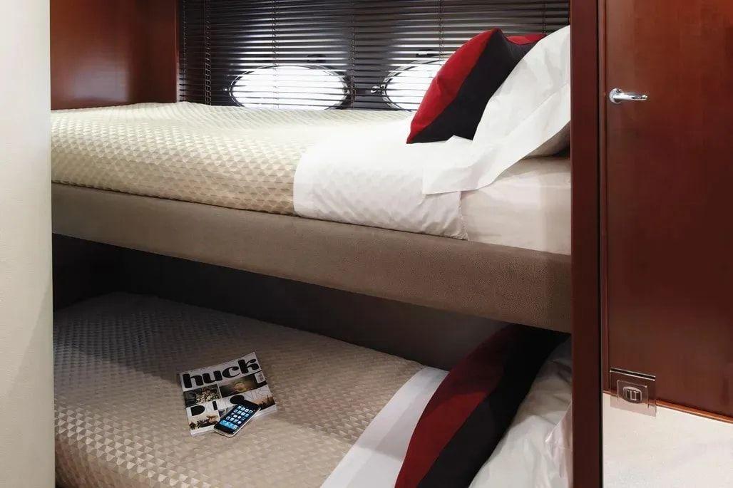 Le yacht peut accueillir huit invités répartis dans quatre cabines, dont trois bénéficient de salles de bains attenantes. Toutes les cabines disposent de boiseries en noyer riche, d'une hauteur sous plafond généreuse et de beaucoup de lumière naturelle. Il y a aussi une cabine d'équipage avec deux couchettes et sa propre salle de bain, offrant à la fois confort et intimité.